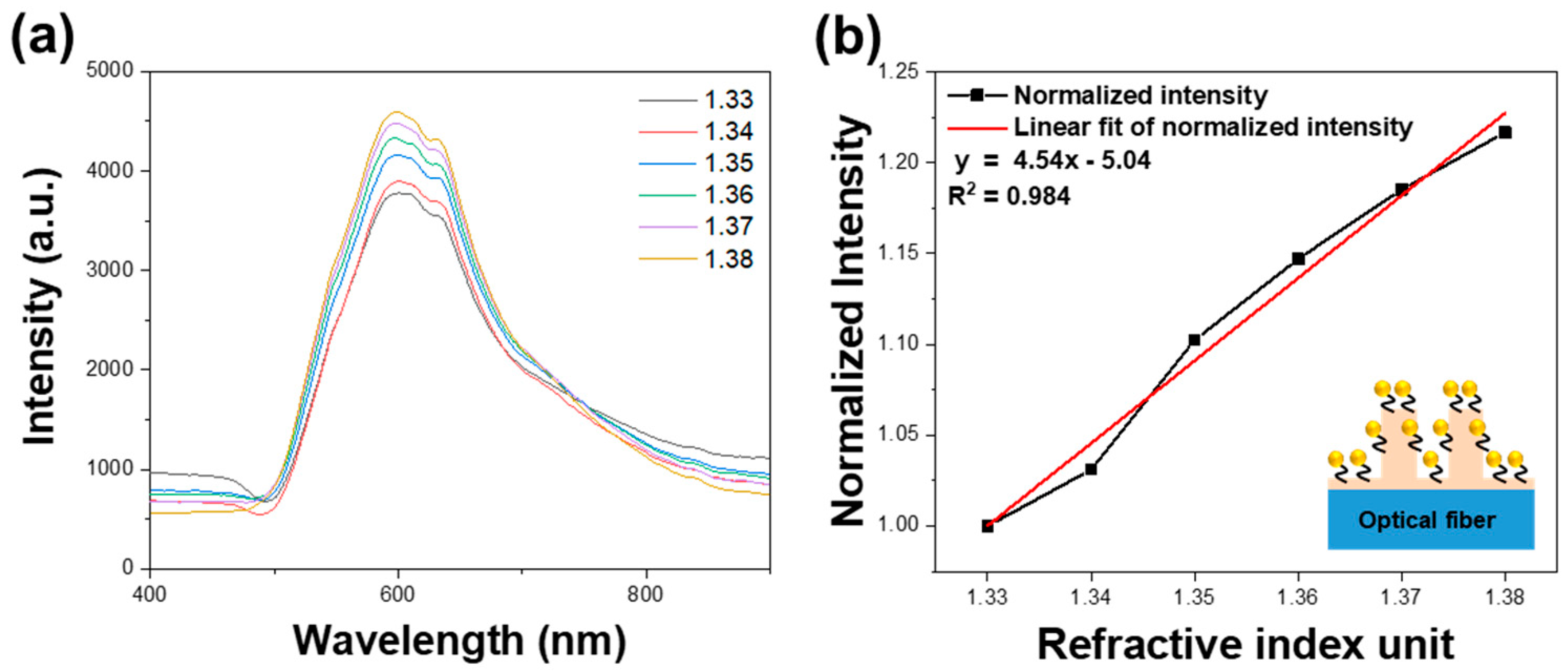 - Lee, S.; Song, H.; Ahn, H.; Kim, S.; Choi, J.-R.; Kim, K. Fiber-optic localized surface plasmon resonance sensors based on nanomaterials. Sensors 2021, 21, 819. [Google Scholar] [CrossRef] [PubMed]
