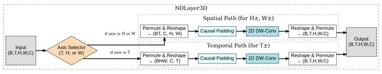 NDLayer3D schematic. Axis selector (choose T, H, or W), per-direction causal padding masks, and shape transitions are annotated. For spatial sweeps (): ; for temporal sweeps (, flipped index): . Each path applies a depthwise conv (3-wide) on the operated axis and reshapes back to .