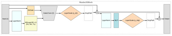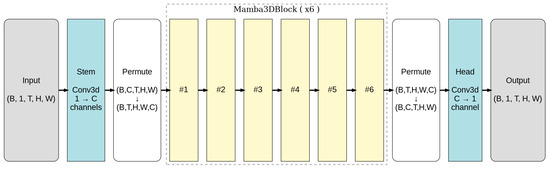 Model overview. The model structure comprises a 3D-Conv stem that embeds inputs into C channels, a stack of Mamba3D blocks operating in channels-last form , and a 3D-Conv head that maps back to one channel of logits for all T slices; inside each block, six directional NDLayer3D operators are applied with causal padding and mixed by an upwind DirGate. LayerScale and optional DropPath are used on both the directional and MLP branches with residual skips, while NDLayer3D permutes/reshapes to apply 2D depthwise convolutions along space and 1D depthwise convolutions along time before restoring the layout (Figure 1, Figure 2 and Figure 3).