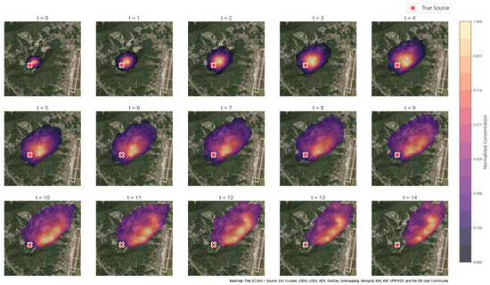 A natural direction is to treat the gridded concentration map—obtained from fast surrogates, physics simulators, or interpolated sensor mosaics—as a spatiotemporal signal and to pose source localization as a data-driven inference task. Early pipelines based on 3D convolutional neural networks (3D CNNs) or hybrid CNN–LSTM stacks (e.g., ConvLSTM [4]) learn useful local motion features, but their compute and memory grow unfavourably with temporal horizon, cubically for deep 3D CNNs (to achieve large receptive fields) and at least quadratically for CNN–LSTM variants that carry recurrent state over long windows [5,6]. Parallel optimization and Bayesian inversions remain attractive for small grids [7,8], yet they typically require explicit wind-field estimates and degrade as resolution or domain size increases. More recently, Transformer-based approaches have recast localization as recursive frame prediction: given recent frames, a model iteratively predicts earlier snapshots until the origin emerges [9]. Transformer models have also been widely adapted to vision tasks [10]. Video Vision Transformer (ViViT) further improved single-pass accuracy [11]; however, global self-attention incurs cost in sequence length L, which constrains temporal reach and throughput, and prior studies primarily address single-source incidents. Related video backbones such as SlowFast and the Temporal Shift Module (TSM) have also been widely adopted for efficient temporal modelling [12,13]. Recent surveys and designs on efficient video backbones further motivate axis-wise, linear-time operators for streaming use cases (see, e.g., [14]).