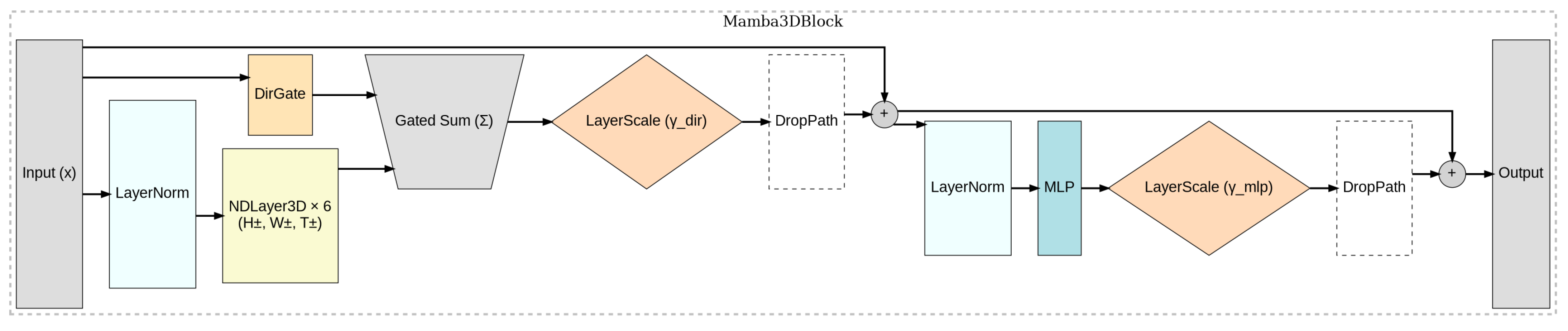 17]. Building on these ideas, we adopt a Visual Mamba-inspired formulation tailored to dispersion grids: rather than implementing explicit associative scans, we realize each axis-wise state update with a one-sided, causal, depthwise operator and learn a convex combination over directions via an upwind gate. This preserves linear scaling, encodes physical causality along the operated axis, and maps cleanly to commodity GPUs through grouped convolutions. In effect, directional depthwise stencils play the role of stable, axis-aligned transports, while the gate adapts to local flow regimes (global/local/hybrid), which we ablate in