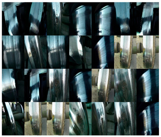 To create the required dataset, images of various types of wheelset tread defects, as shown in Figure 1, were first captured. However, the number of useful defect images was limited and typically unbalanced. Therefore, preprocessing was performed to expand the sample size. The dataset was first expanded using traditional data augmentation and Copy–Paste; the results are shown in Figure 2. A dataset comprising 654 images was thus obtained; however, as it was insufficient, the StyleGAN3 network was introduced and trained. Figure 3 shows the wheelset tread defect images generated using StyleGAN3. To address imbalances in the dataset, StyleGAN3 was used to selectively generate the corresponding defective images for dataset expansion, and a new dataset comprising 1200 images was obtained. The defects were labelled using LabelImg software, and the dataset was divided into training, validation, and test sets in an 8:1:1 ratio. The training set was further expanded to 4800 images by splicing and blending the augmented data with Gaussian blur, affine transform, luminance transform, descending pixel transform, and flip transform [29,30]. The statistical information for the dataset is presented in Table 1. There were significant dimensional differences among the different defects, as shown in Figure 4.