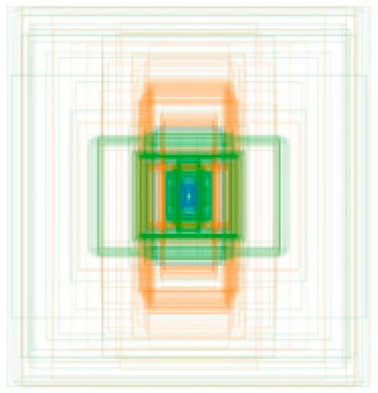 CIoU is sensitive to aspect ratio variations; thus, aspect ratio matching is generally overemphasized at the expense of other factors such as the overall positional relationship of the target. Therefore, enhanced intersection over union (EIoU) [34] is mainly used in target detection to evaluate the difference between predicted and real bounding boxes. The expression for is presented in Equation (11).