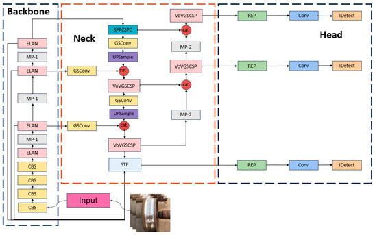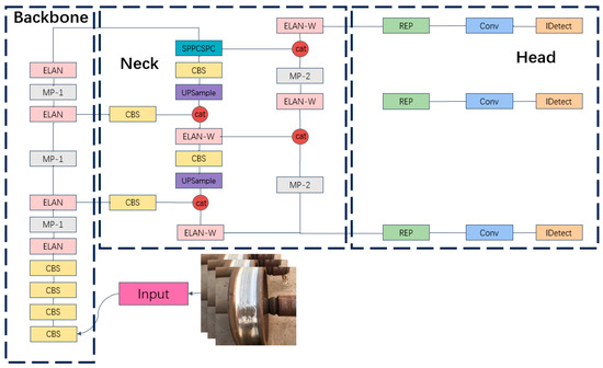 YOLOv7 is a widely used detection network and is suitable for scenes requiring high detection accuracy. The network structure comprises Head, Neck, and Backbone modules as shown in Figure 5. There are three common variants of the YOLOv7 model—YOLOv7, YOLOv7x, and YOLOv7tiny. YOLOv7tiny is the smallest model with a fast detection speed and relatively low accuracy, and it is mainly applied to scenes with high speed requirements or limited computational resources. In this study, YOLOv7 was used as the base model, and a few parameters were adjusted to improve the model’s performance.