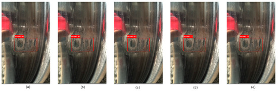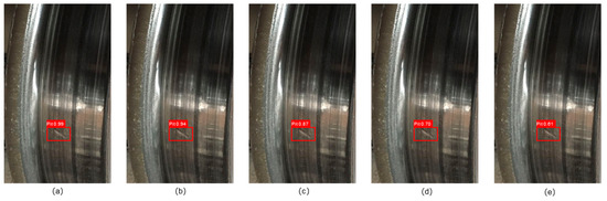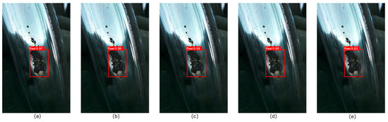 To verify the superiority of the proposed YOLOv7-STE model for wheelset tread damage detection, the results were compared with those of YOLOv7, YOLOv5, SSD, and Faster R-CNN models. The relevant parameters of the experiments were strictly controlled using a uniform image size as the input and a uniform training and test set for experimental testing. The experimental dataset used is detailed in Table 1; the control environment and parameter settings for the experiments were the same. A comparison of the recognition of pits using the different models is shown in Figure 8. The confidence levels of detection results of YOLOv7-STE, YOLOv7, YOLOv5, SSD, and Faster R-CNN were 0.96, 0.86, 0.77, 0.69, and 0.58, respectively. The recognition of bruises using the different models is shown in Figure 9. The confidence levels of YOLOv7-STE, YOLOv7, YOLOv5, SSD, and Faster R-CNN detection results were 0.95, 0.91, 0.92, 0.85, and 0.77, respectively. Figure 10 shows a comparison of the recognition results for Peel by different models. The confidence levels of YOLOv7-STE, YOLOv7, YOLOv5, SSD, and Faster R-CNN detection results were 0.97, 0.95, 0.95, 0.90, and 0.89, respectively. The experimental results indicate that the proposed method was more adaptable to complex backgrounds than the other models and achieved better inspection performance.