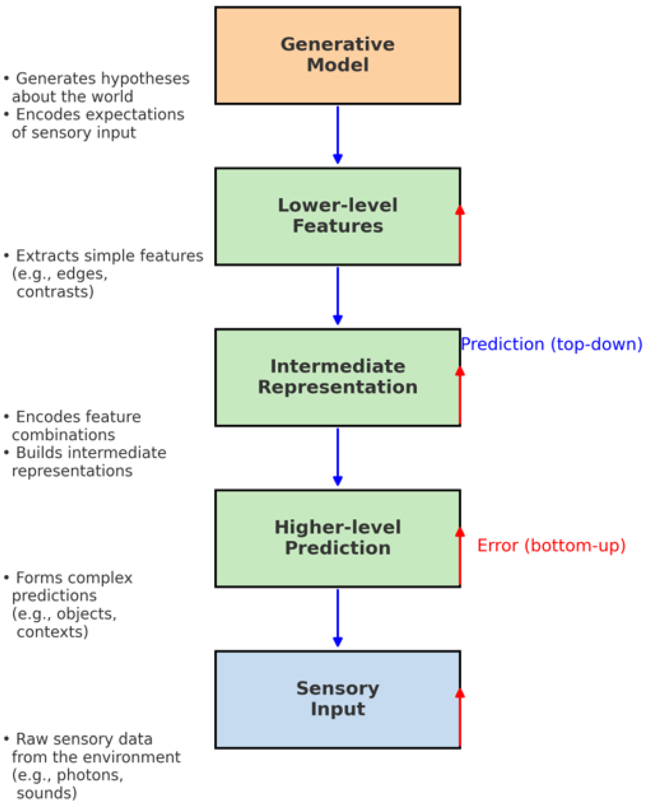 - Perception arises as the result of minimizing the difference between prediction and input.