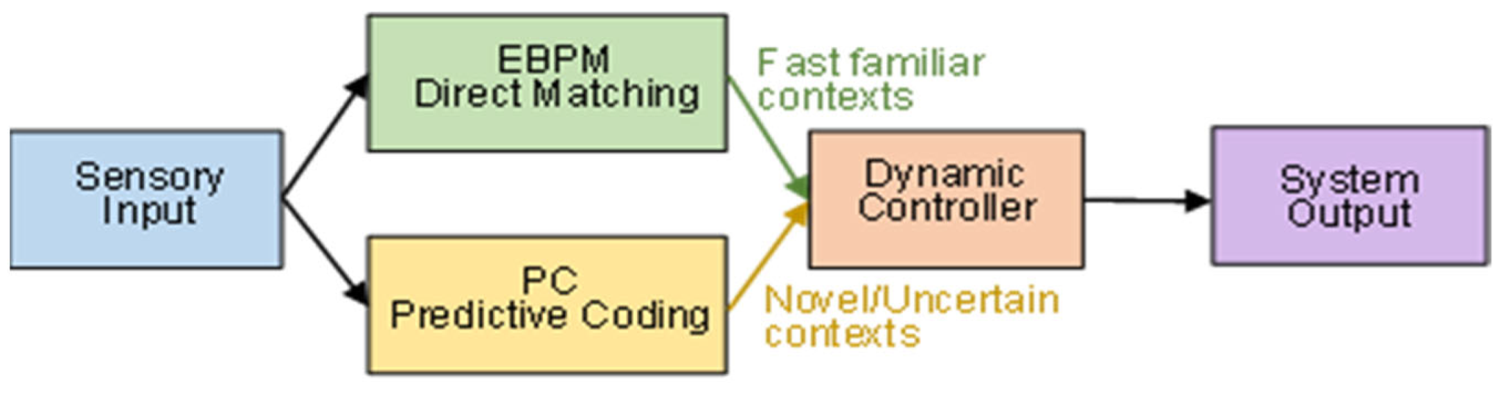 - Dynamic controller: a central mechanism evaluates the context (level of familiarity, uncertainty, noise) and selects the dominant pathway.