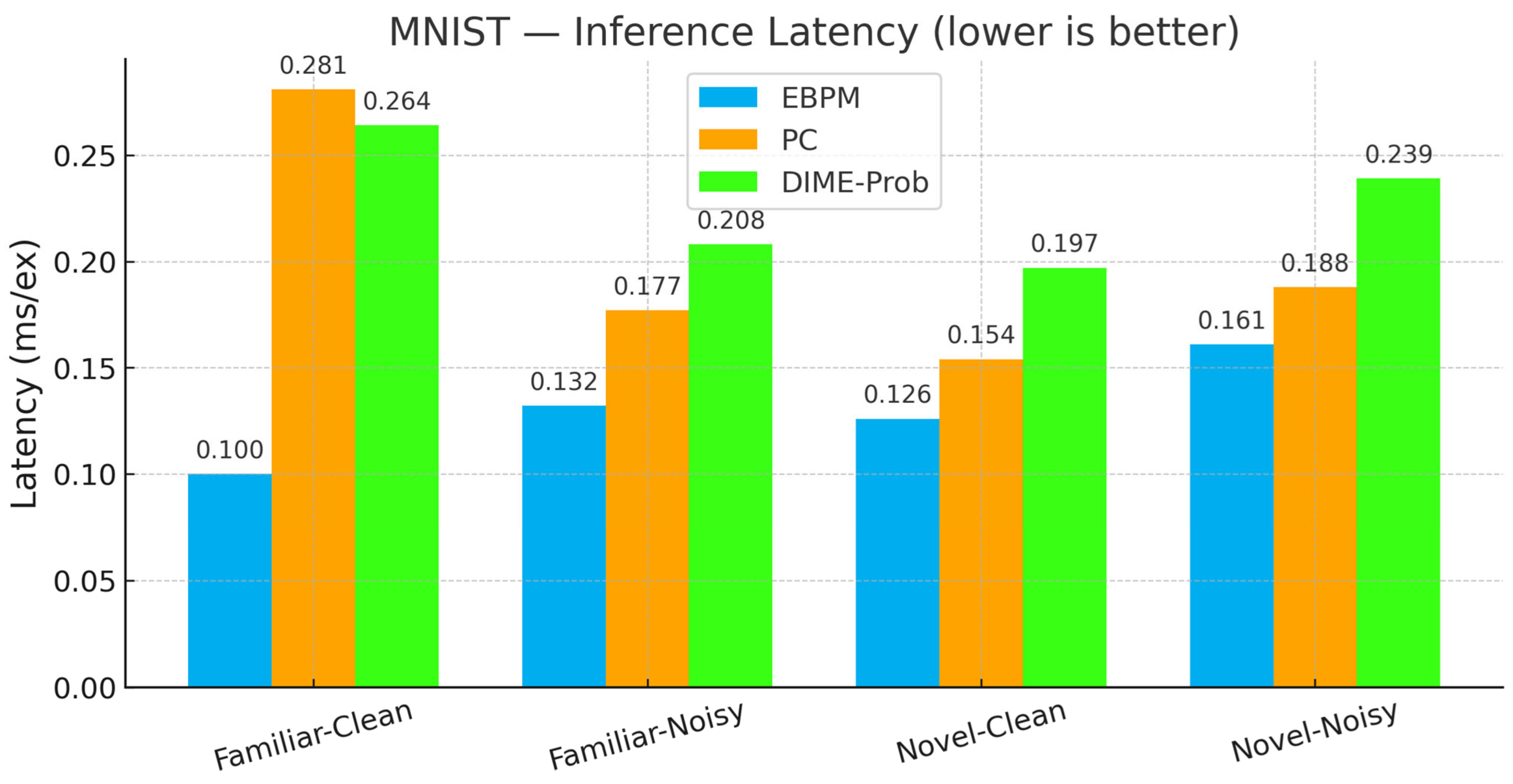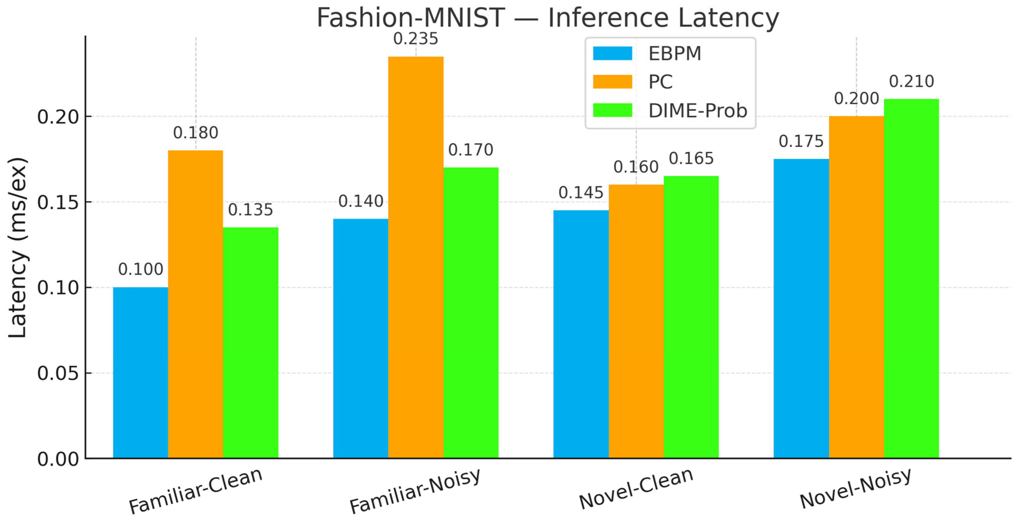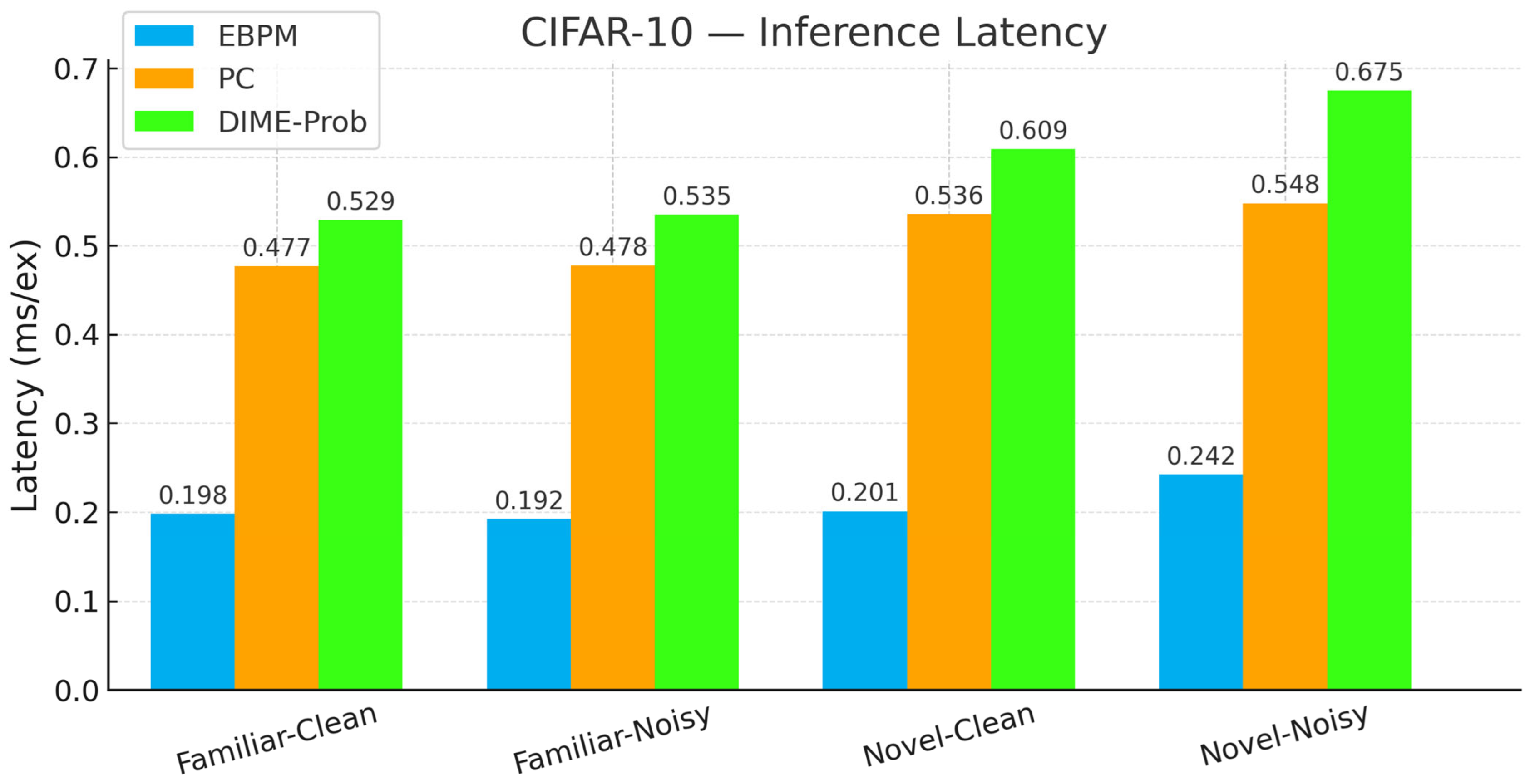- EBPM—Familiar-Clean: 98.63%, 0.100 ms/ex; Familiar-Noisy: 97.13%, 0.132 ms/ex; Novel: 0.0%.