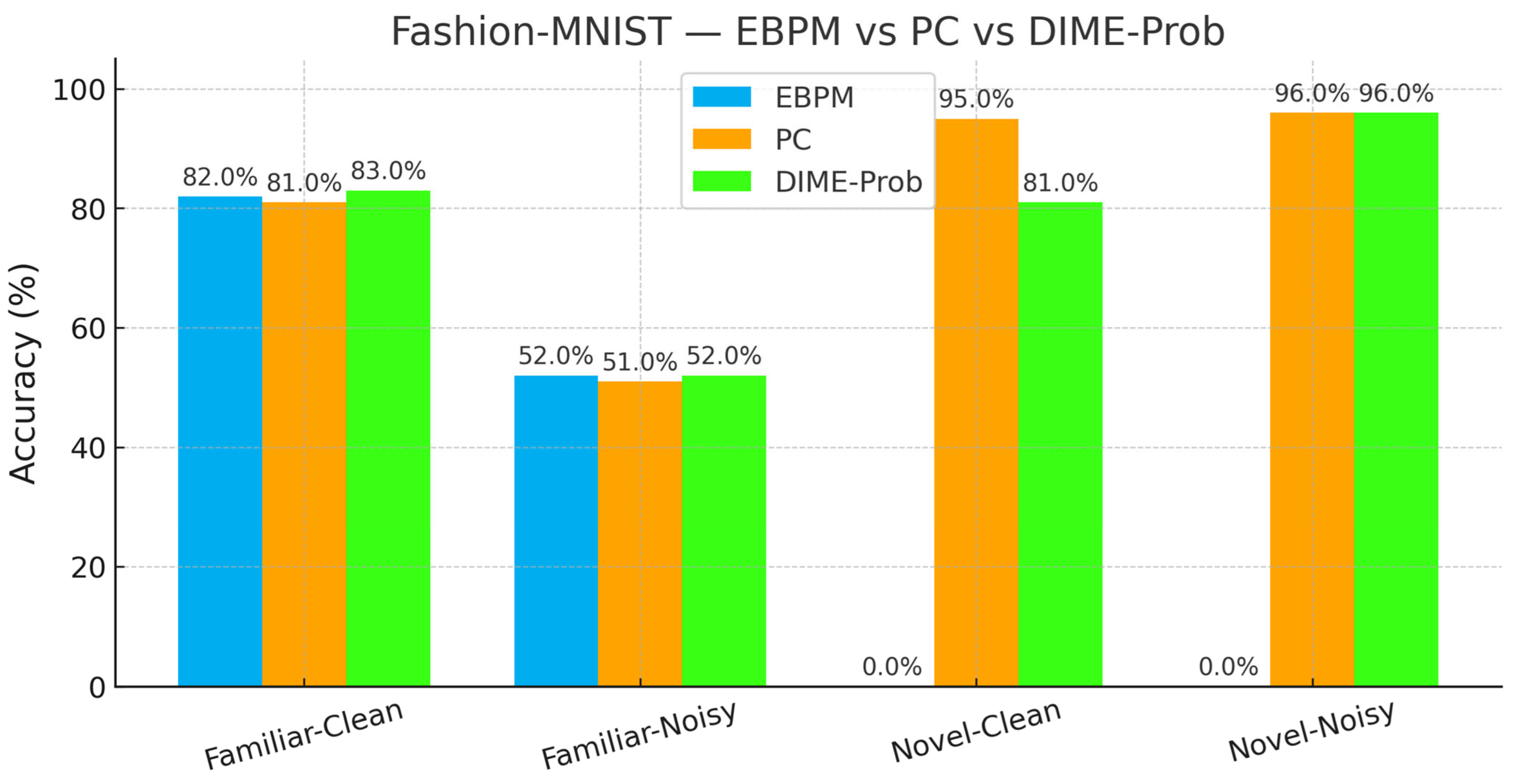 - DIME-Prob (probability-level fusion): p = α·p_EBPM + (1 − α)·p_PC, with α driven by a familiarity score calibrated on familiar validation data. On CIFAR-10, we tune {gain = 4.0, thr_shift = 0.75, T_EBPM = 6.0, T_PC = 1.0}.
