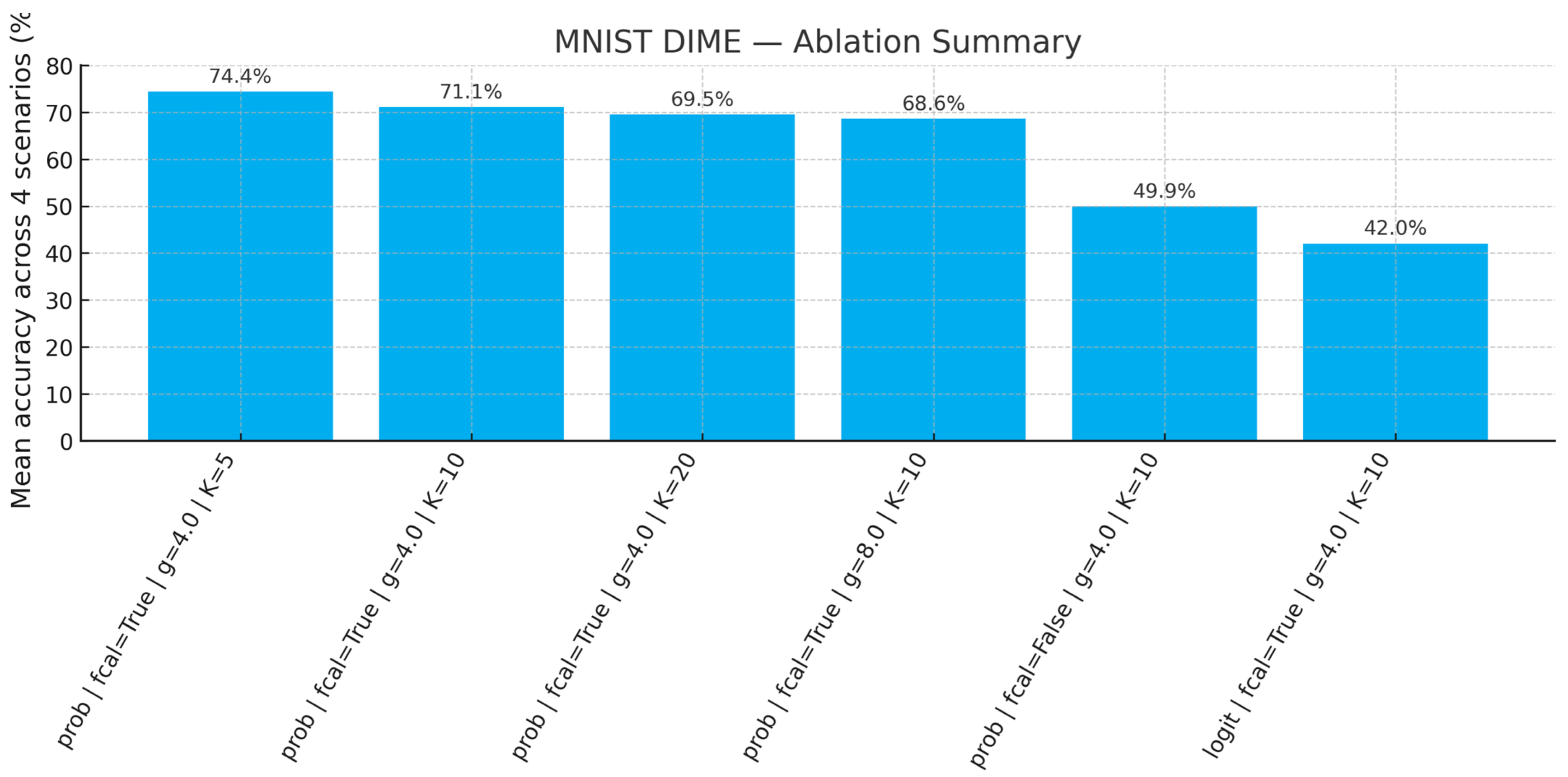 - DIME-Prob (probability-level fusion)—Familiar-Clean: 96.47%, 0.264 ms; Familiar-Noisy: 58.68%, 0.208 ms; Novel-Clean: 93.65%, 0.197 ms; Novel-Noisy: 36.16%, 0.239 ms.