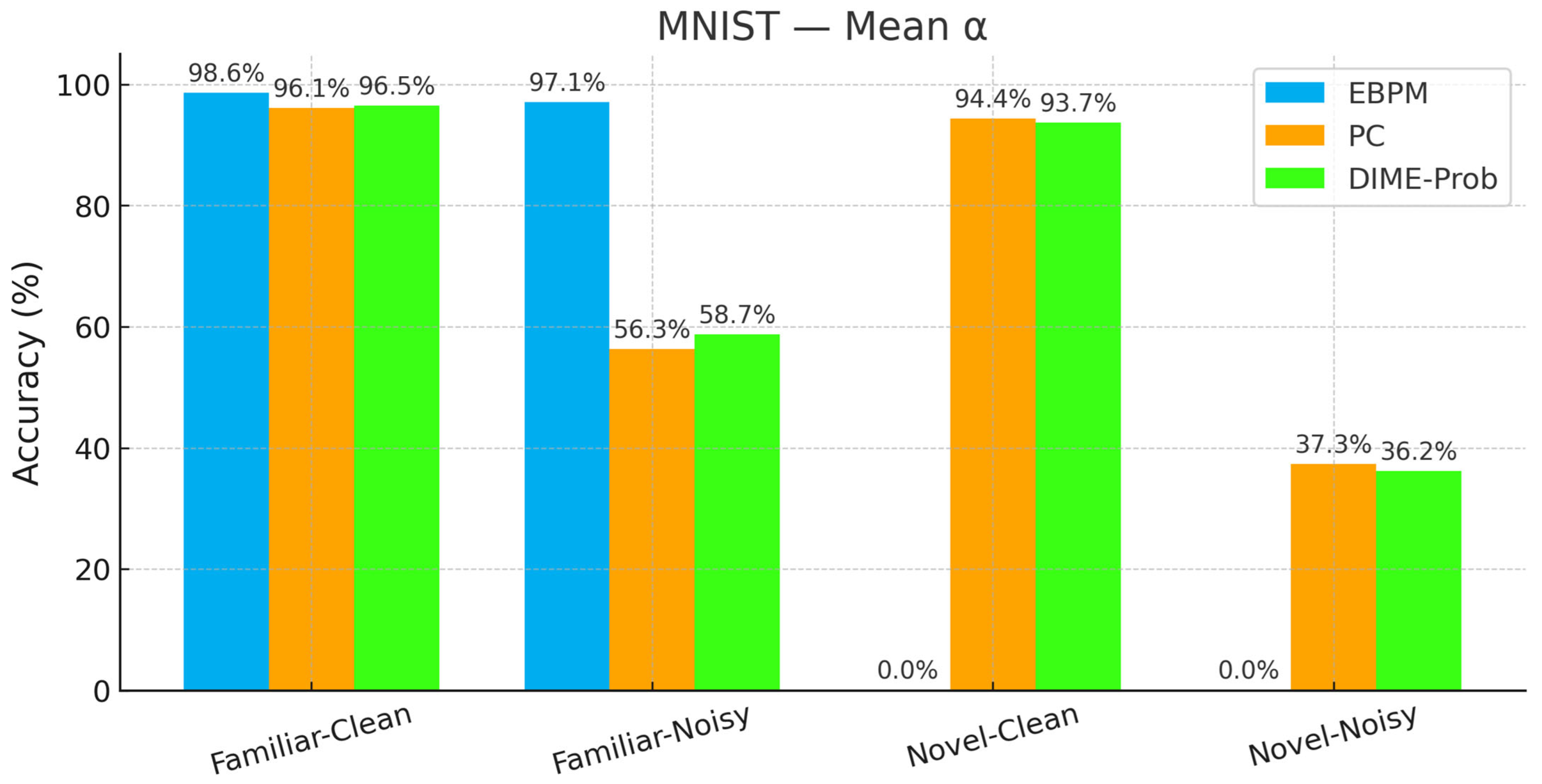 - EBPM—Familiar-Clean: 82.56%, 0.101 ms; Familiar-Noisy: 52.35%, 0.139 ms; EBPM reports ≈0% accuracy on novel inputs, consistent with its design as a novelty detector: sub-engrams activate but do not yield a full engram. This produces an explicit novelty signal, rather than a forced classification.