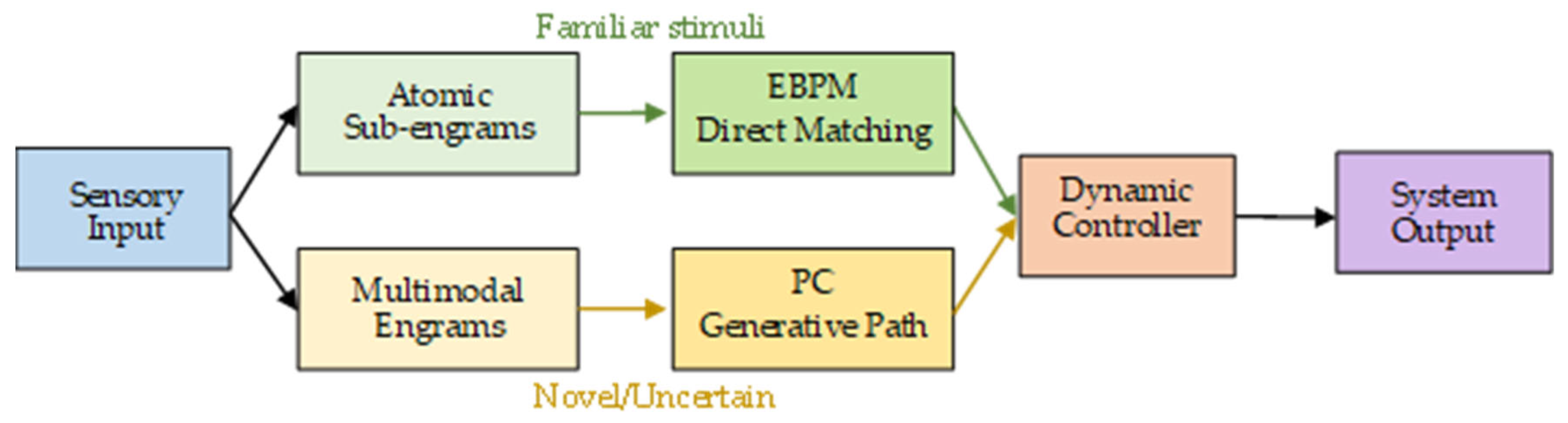 - Dual-path processing: sensory input is processed simultaneously through direct engram matching (EBPM) and top-down prediction (PC).
