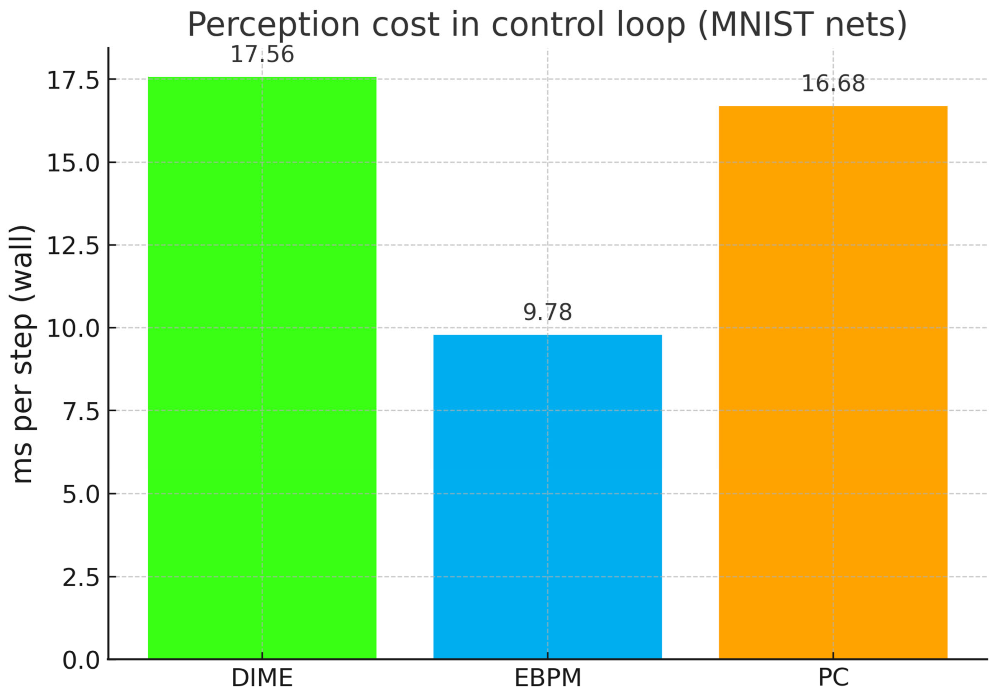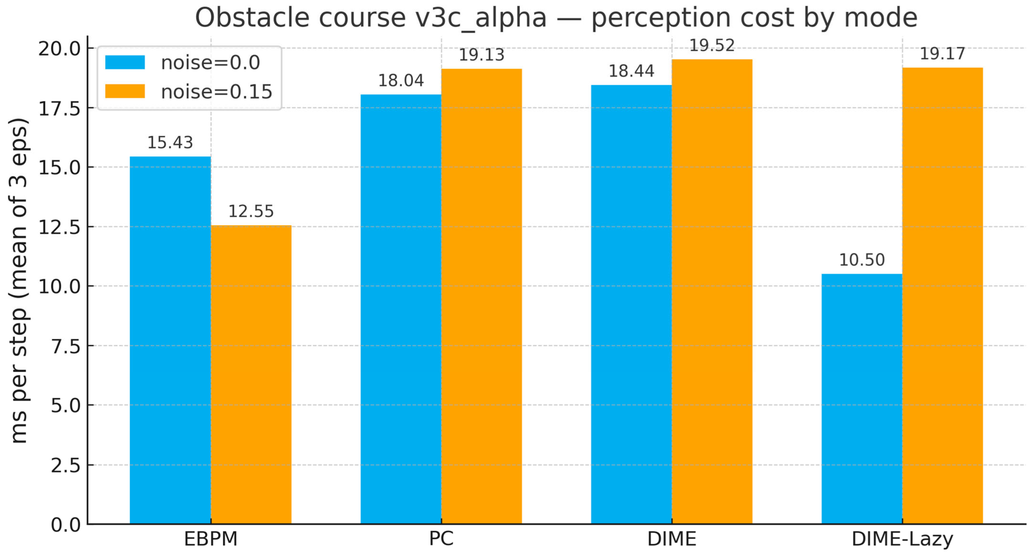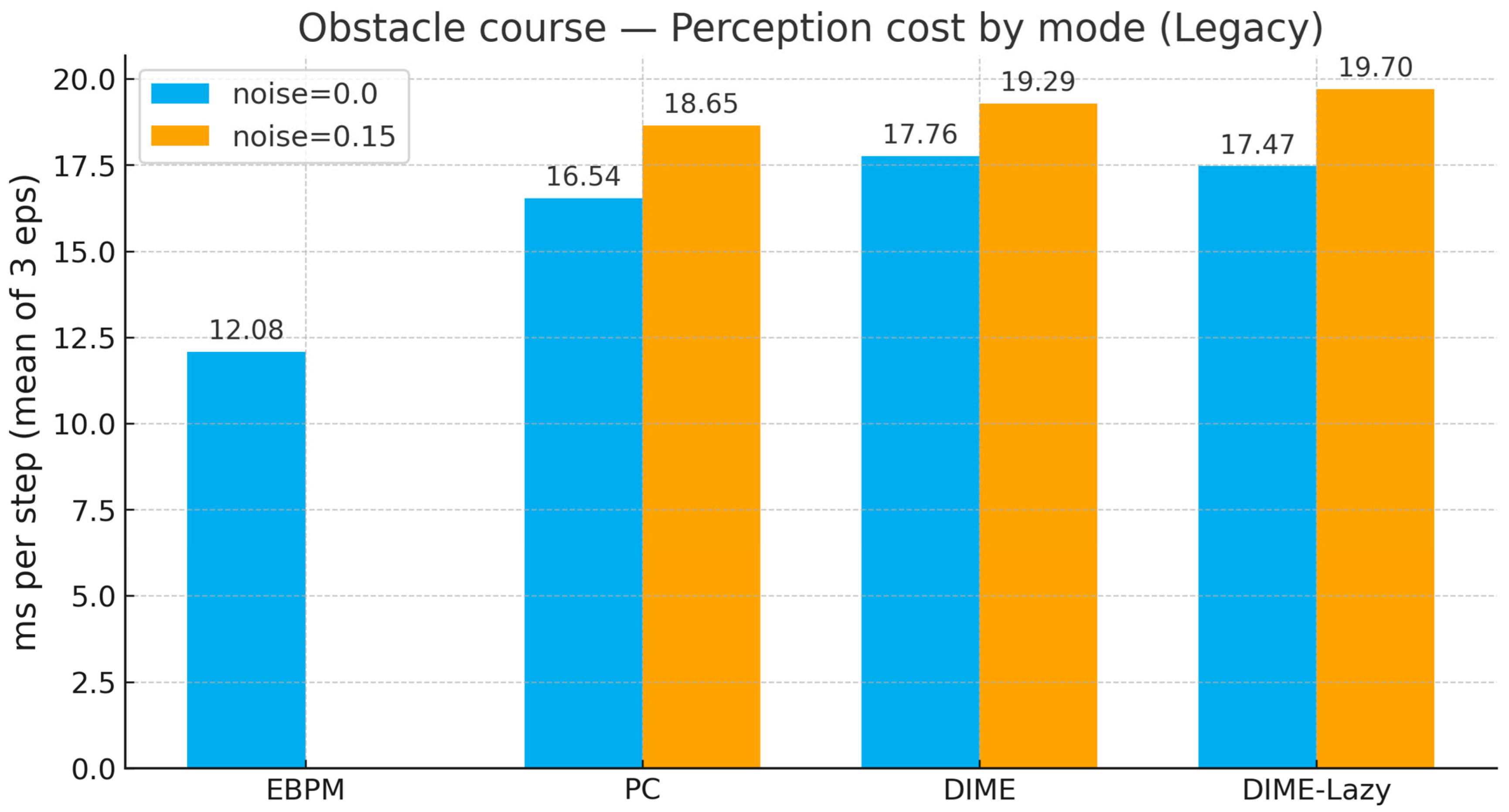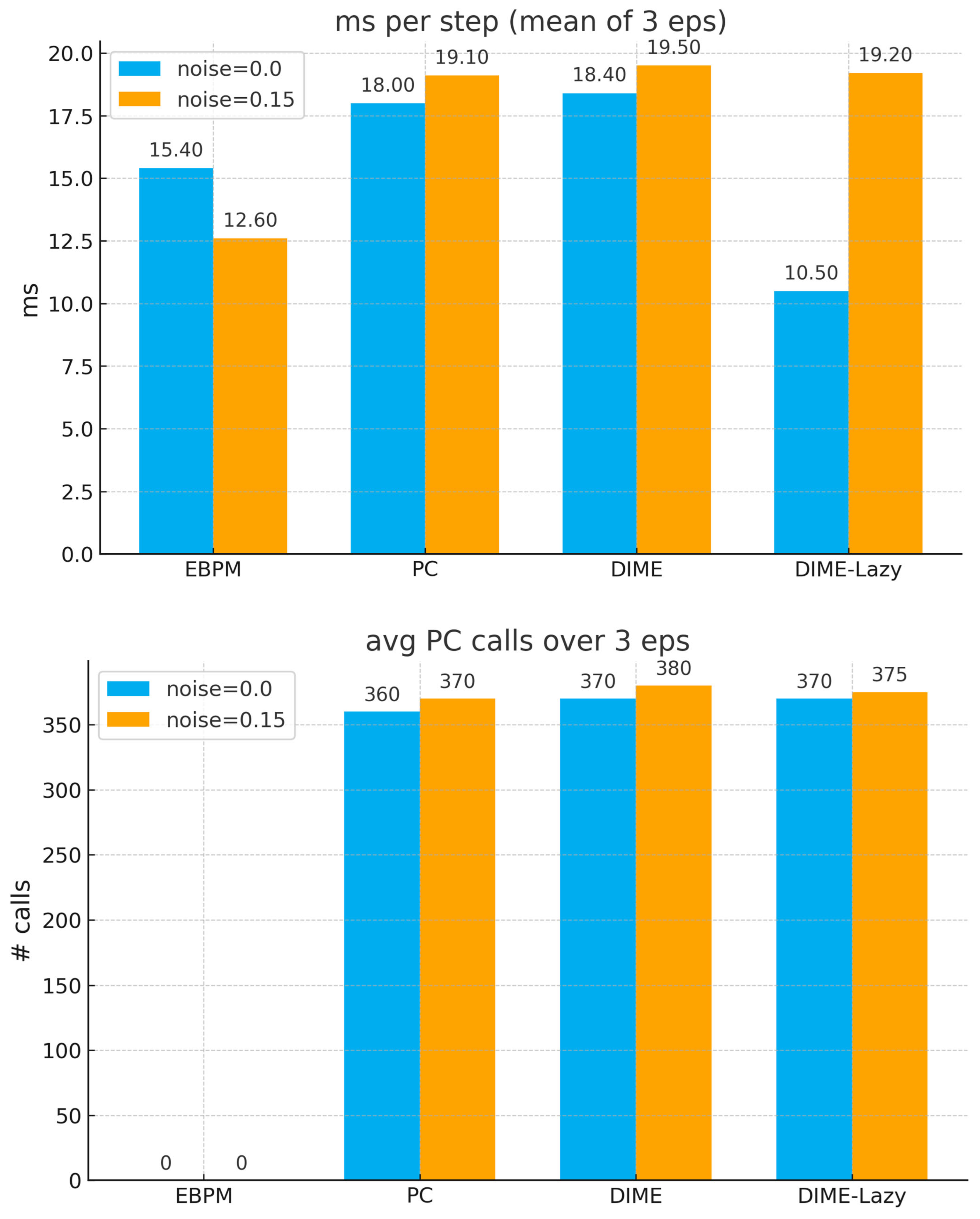 - H4 (Behavioral/robotic efficiency): Under stable familiarity, EBPM leads to lower inference time and energy cost than PC; under novelty/noise, DIME shifts toward PC to preserve robustness.