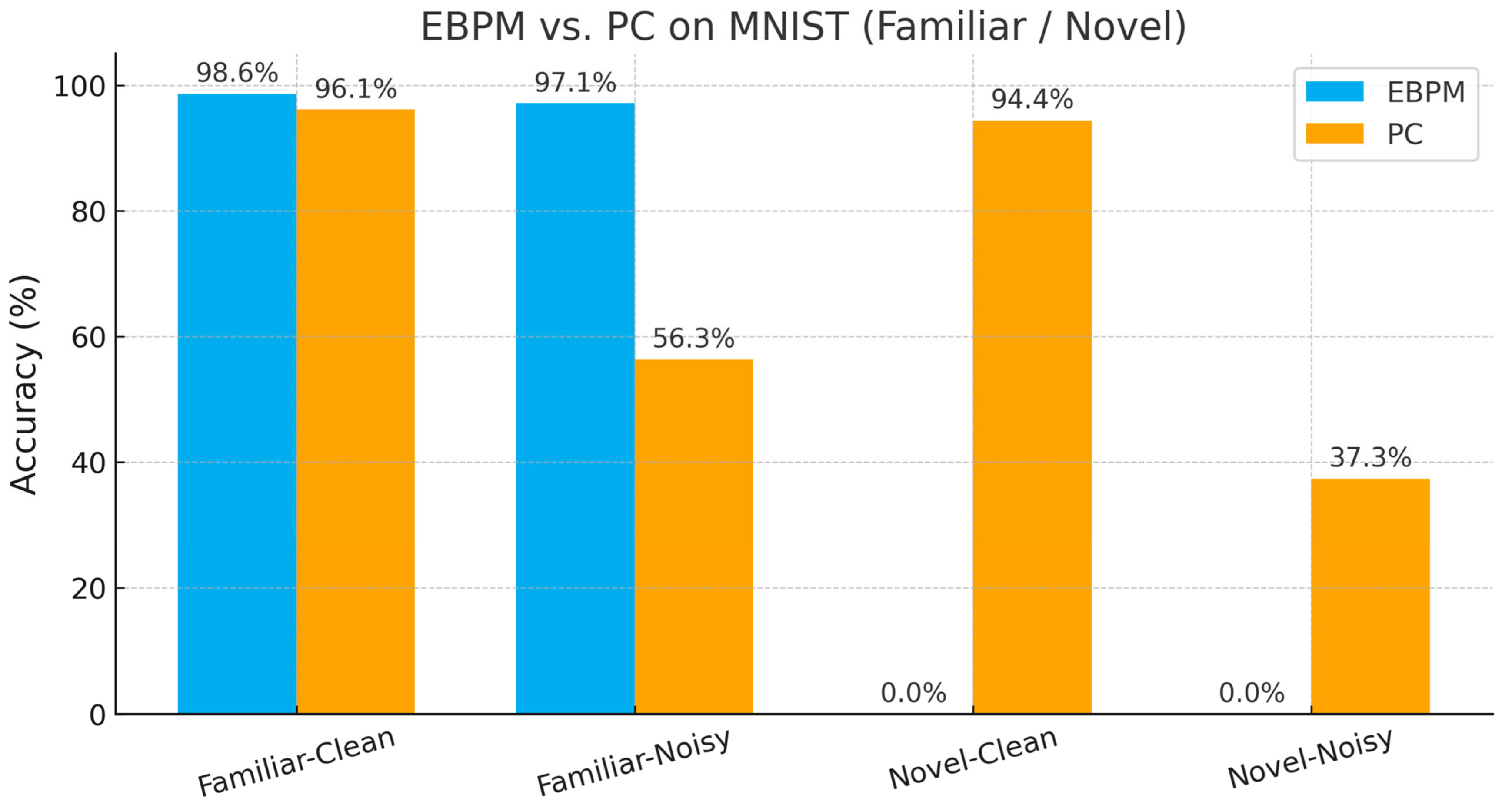 - Novelty-First Decision with Explicit Abstention: By design, EBPM yields near-zero classification on truly novel inputs. Partial activation of sub-engrams is treated as a reliable novelty flag—not as a misclassification. This sharp separation of recognition versus novelty is absent from PC’s iterative reconstruction loop and from generic prototype schemes.