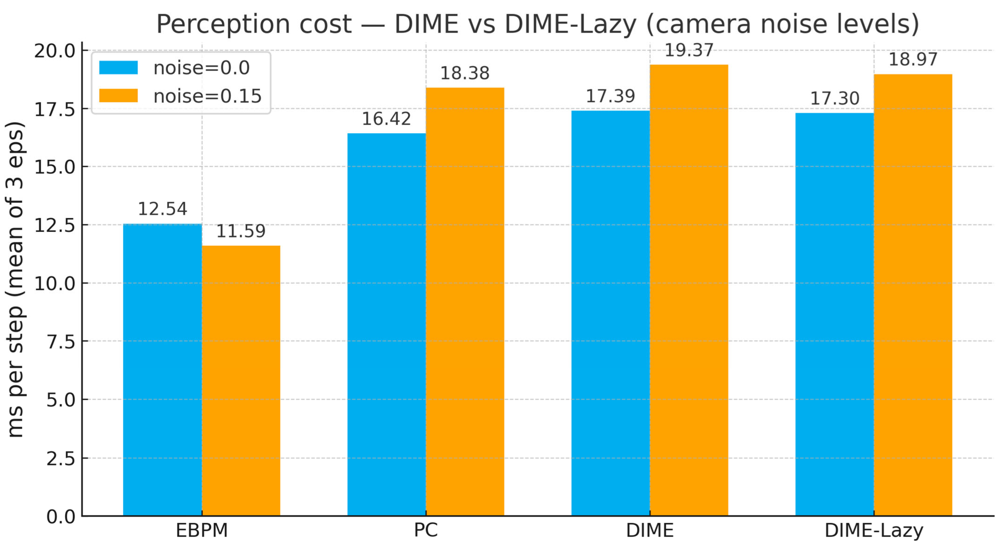 - DIME-Lazy (runtime-aware gating, used in robotics): δ = mean(|I_t − I_{t − 1}|). If δ ≤ 0.004 → EBPM-only; if δ ≥ 0.015 → PC-only; otherwise, fuse with fixed α = 0.65.