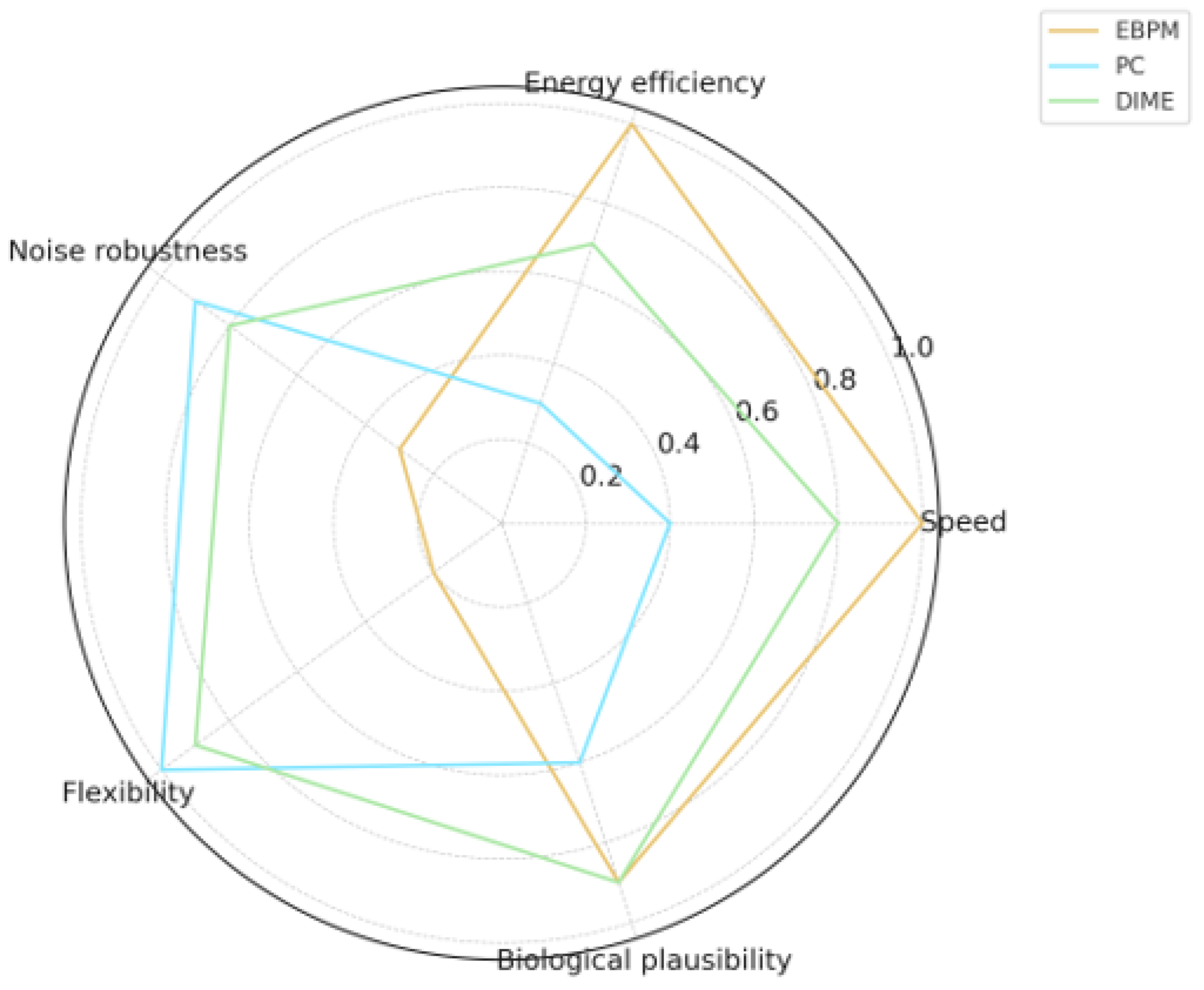 Predictive Coding/Active Inference [1,2,3,21,22] | Top-down generative predictions + iterative error minimization. | Shares attentional modulation and context use. | Robust reconstruction under missing data via generative loops. | EBPM delivers instant responses on familiar inputs (no iterative inference) with lower compute/energy; DIME then falls back to PC for novelty. |
