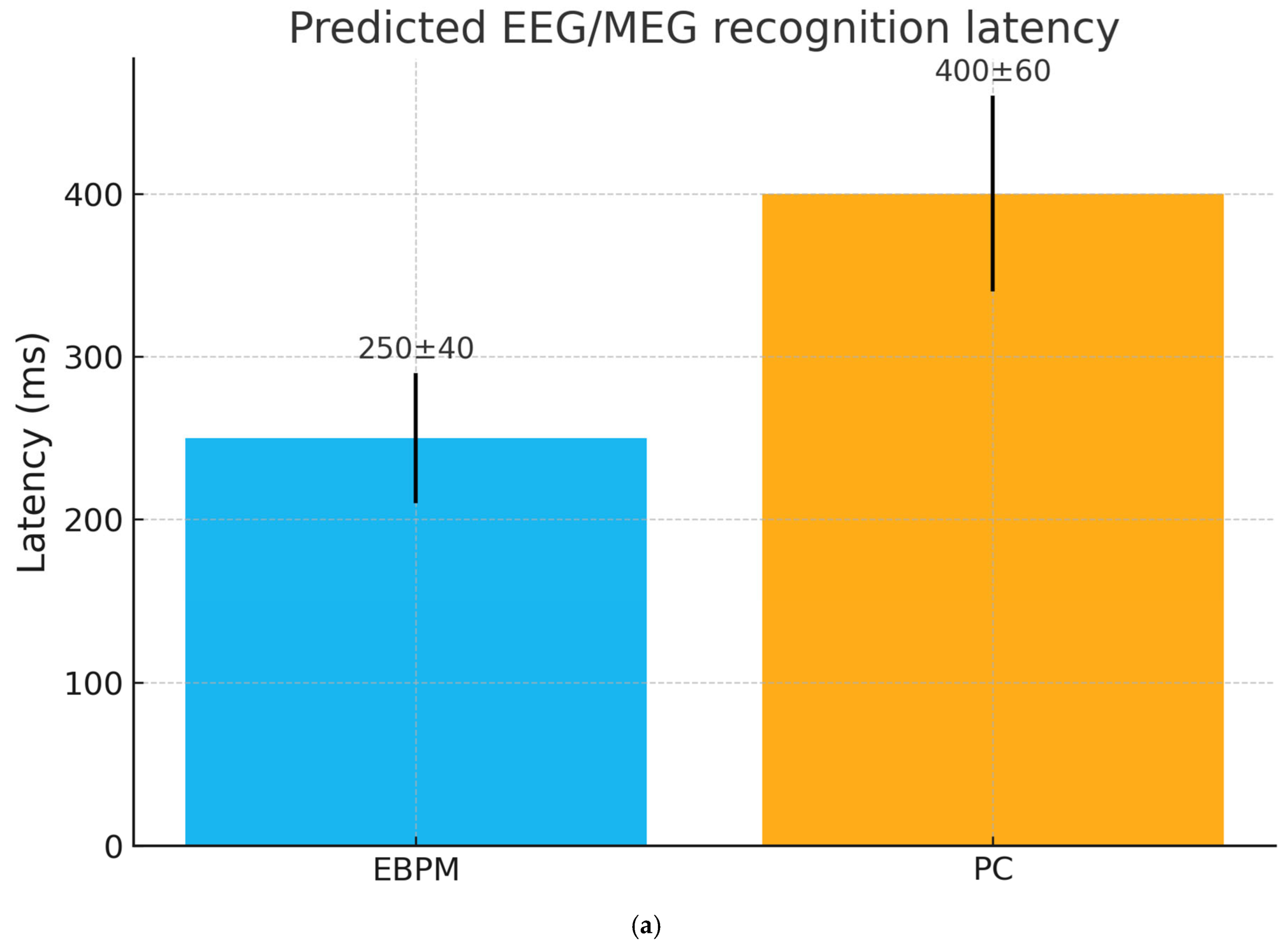 - H1 (EEG/MEG latency): EBPM-dominant trials (familiar stimuli) yield shorter recognition latencies (≈200–300 ms) compared to PC-dominant trials (≈350–450 ms). We base the ≈200–300 ms range on recent EEG evidence indicating that recognition memory signals emerge from around 200 ms post-stimulus across diverse stimulus types [29].