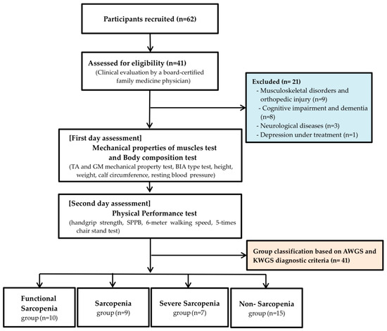 Consort flowchart. TA: Tibialis Anterior, GM: Gastrocnemius Medialis, BIA: Bioelectrical Impedance Analysis, SPPB: Short Physical Performance Battery, AWGS: Asian Working Group for Sarcopenia: KWGS, Korean Working Group for Sarcopenia.