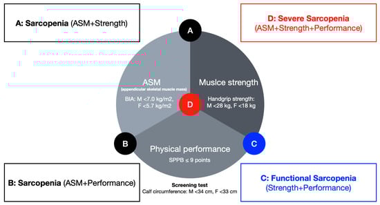 - Chen, L.K.; Woo, J.; Assantachai, P.; Auyeung, T.W.; Chou, M.Y.; Iijima, K.; Jang, H.C.; Kang, L.; Kim, M.; Kim, S.; et al. Asian Working Group for Sarcopenia: 2019 Consensus Update on Sarcopenia Diagnosis and Treatment. J. Am. Med. Dir. Assoc. 2020, 21, 300–307.e2. [Google Scholar] [CrossRef]