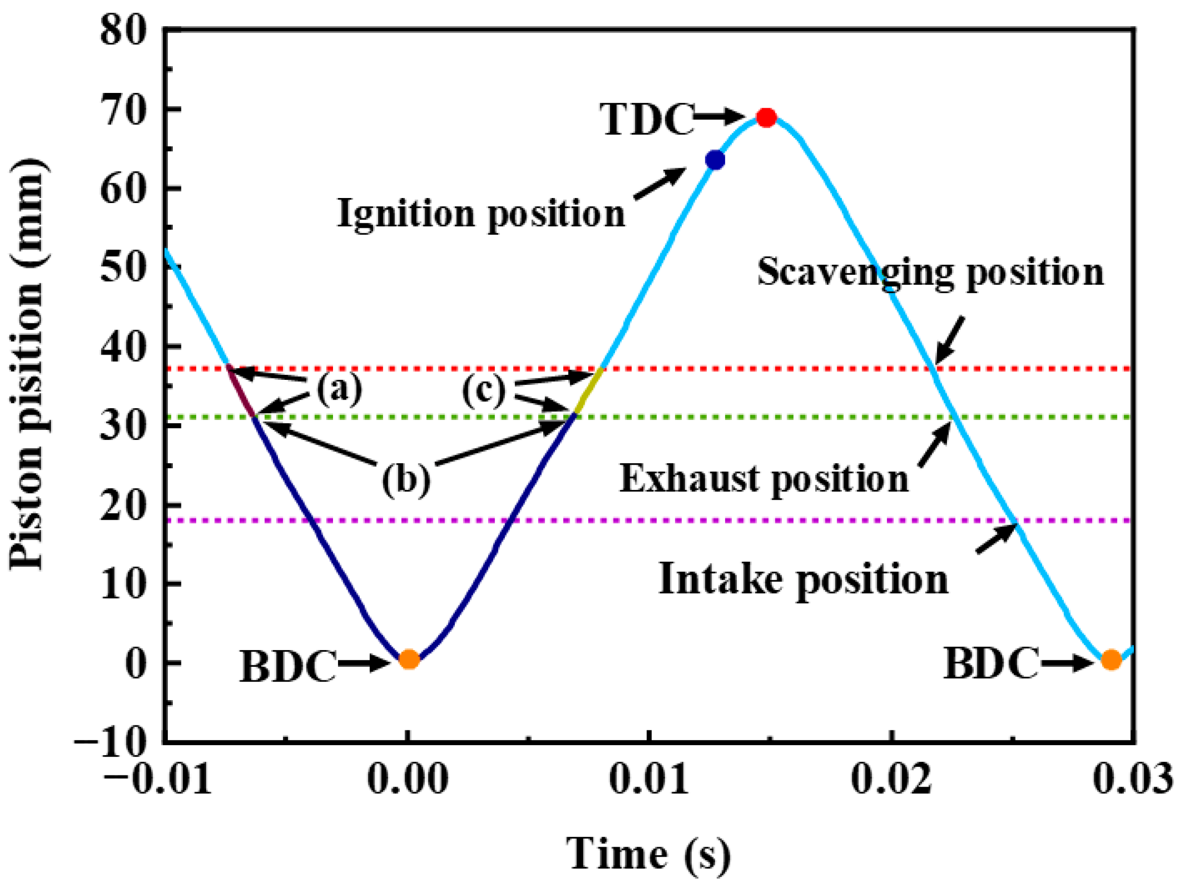 - Free scavenging phase: The exhaust port opened until the intake port opened. Following the in-cylinder combustion stage, the gas within the cylinder is at high temperature and pressure, causing the residual exhaust gases to be rapidly expelled through the exhaust port. As the exhaust port gradually opens, the pressure and temperature inside the cylinder decrease, leading to a gradual reduction in the flow rate of the residual exhaust gases.