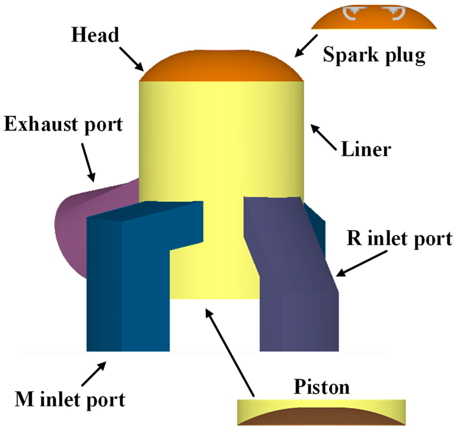 - Duan, X.; Zhang, S.; Liu, Y.; Li, Y.; Liu, J.; Lai, M.-C.; Deng, B. Numerical investigation the effects of the twin-spark plugs coupled with EGR on the combustion process and emissions characteristics in a lean burn natural gas SI engine. Energy 2020, 206, 118181. [Google Scholar] [CrossRef]