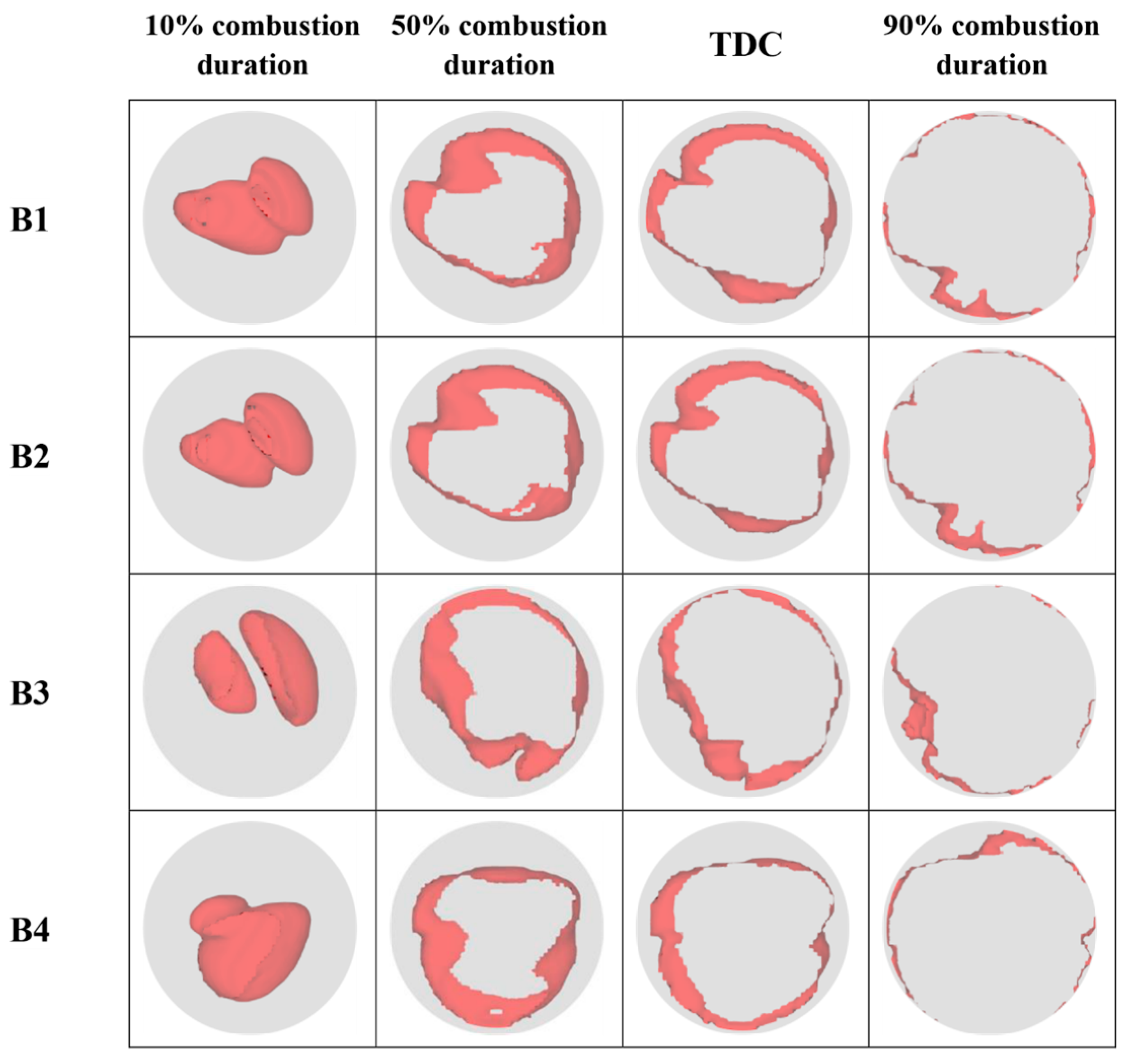 - Regardless of the ignition scheme employed, the two separate flame cores formed by the spark plugs are affected by the ignition arrangement and the strong counterclockwise return flow within the cylinder, and the flame cores gradually develop from the right side to the left side. In this process, the right-side flame core will gradually engulf the left-side flame core. At 50% combustion duration and TDC moment, the flame cloud map of the asynchronous ignition scheme shows more uniform propagation characteristics, and the flame front tends to be round.