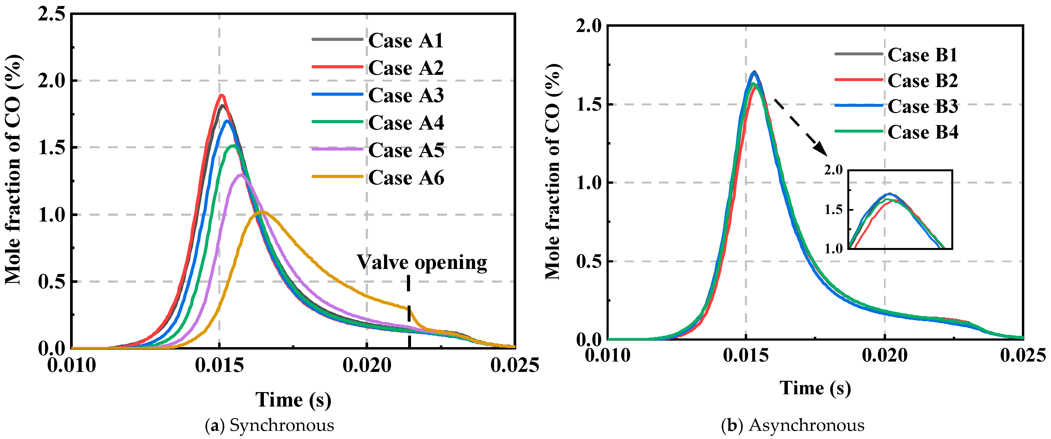 - Delaying the synchronized ignition to L-32 mm/R-30 mm, the NOx mole fraction reaches its lowest value due to the lower temperature in the cylinder. However, CO and HC emissions increased significantly due to incomplete combustion. Compared to the synchronous schemes, the asynchronous schemes showed less difference in emissions and did not exhibit significant emission fluctuations, and the overall emissions were low.