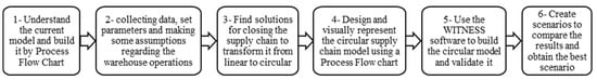 Several steps are essential to construct the model, as outlined in Figure 1. The process begins with understanding the current operations of the warehouse to detect key parameters and identify sources of waste. This understanding will be developed by applying a flow map of the process, which helps visualise how materials move through the system. Once the current operations are clear, the next step involves reviewing and defining the parameters that will shape the model. After that, a set of assumptions is introduced to address any missing or unclear data. This is followed by an analysis of the current model’s outcomes to identify areas for improvement. These improvements are important for transitioning the model from a traditional process to a closed-loop, circular system. The final step is to propose the enhanced model based on all previous points.