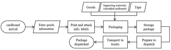 The process flow map presented in this section is intended to depict the main cardboard handling processes. It is important to note that no directly comparable work was found in the literature. Consequently, the map was developed based on related studies and observations of warehouse operations. Figure 2 illustrates the current module, showing cardboard operations from arrival at the warehouse through to dispatch.