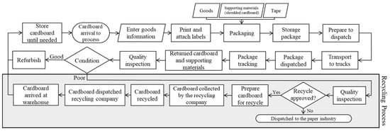 The linear supply chain is converted into a circular and more sustainable system to minimise waste and improve resource efficiency. All the proposed solutions in the previous sections—such as contract-based returns, loyalty incentives, condition-based refurbishment or recycling, and low-cost tracking—are integrated to improve the circular model. This new model was built by applying the flow map concept, which provides a clear and comprehensive visual representation of the entire lifecycle of cardboard, as illustrated in Figure 4.