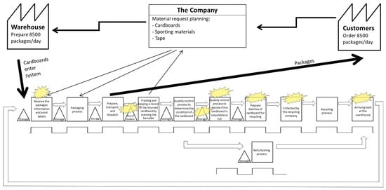 Value Stream Mapping (VSM) was systematically integrated into the simulation process to identify and eliminate non-value-adding activities. As shown in Figure 5, a detailed VSM was manually constructed to analyse each process. All aspects of the system were considered, from the arrival of materials into the system to the final recycling stage. Time, resource usage, and queue durations were assessed for each element in the model. The map was reviewed to identify areas that need improvement. These potential areas have been highlighted with a KanBan burst symbol, indicating the need for a thorough assessment to determine more effective and efficient implementation strategies.