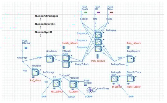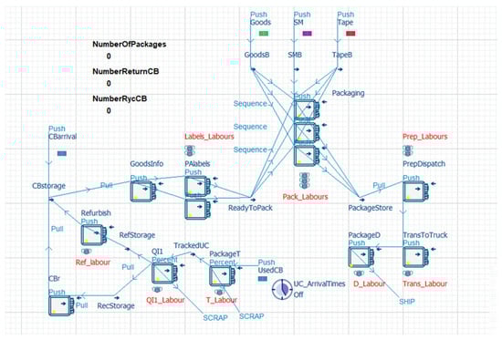 In other work, [] applied DES to improve internal production and logistics processes. Their findings show that simulation can help identify inefficient areas and improve them without disrupting the real operations. Reference [] also emphasised that DES can align with circular principles like reduce, reuse, and recycle. Mainly when planning a sustainable production system.