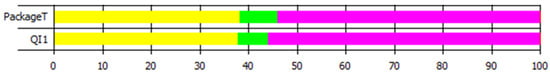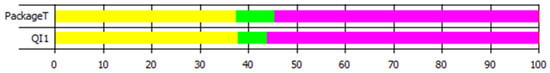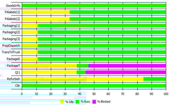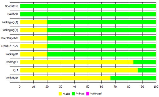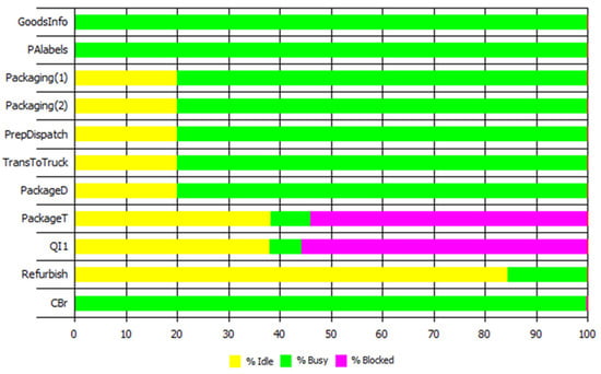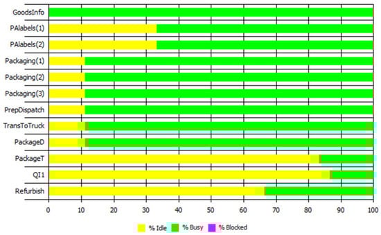 Scenario 1 (S1) used the original model with the internal recycling process (as shown in Figure 8). Scenario S7 used a lean model without recycling. Both ran under off-peak demand for one month. In S1, some processes, such as PackageT (scanning barcodes and tracking returned cardboard) and QI1 (cardboard quality control), showed high levels of cycle wait labour. This indicated blocking and delays in the system. Several machines also had more idle time, which reduced overall utilisation. The recycling loop introduced extra complexity, and some stations waited for resources to become available. In contrast, S3 showed better flow across the entire system (as shown in Figure 9). All stations were active with no signs of blocking or cycle wait. Machines like GoodsInfo, Packaging, and TransToTruck had high utilisation. Process times were shorter and more consistent. The system smoothly transitioned items from one step to the next. The Refurbish station stayed idle in S3 since recycling was not included. This confirmed that it was no longer needed in the lean setup. Overall, the lean model in S3 worked more efficiently under low demand. It reduced idle time, avoided delays, and simplified process flow.