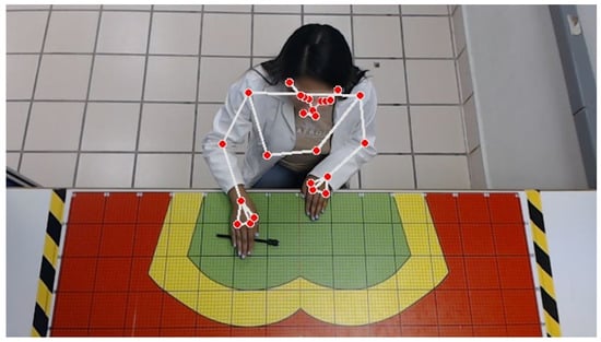 The process begins with human pose detection using the MobileNetV2 CNN architecture, selected for its proven effectiveness in both hand tracking and full-body pose estimation []. The model identifies key landmarks , each represented by normalized coordinates relative to the image width and height. Cartesian coordinates are then obtained by scaling each landmark as and . Based on the motions defined in MTM-2, this study focused on the upper-body joints most directly involved in manual assembly tasks: left shoulder, right shoulder, left elbow, right elbow, left wrist, right wrist, left thumb, tip of the left pinky, and tip of the right pinky, as illustrated in Figure 1.