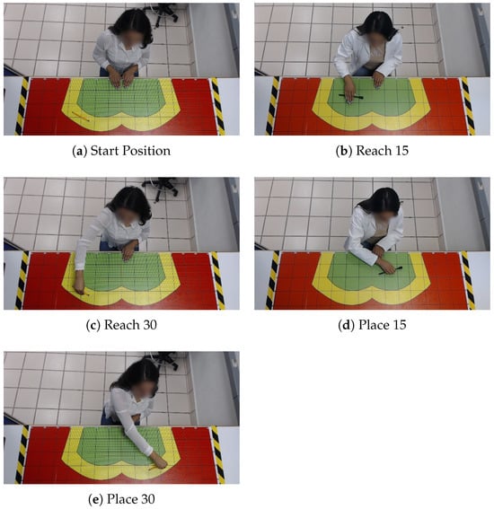 To obtain a variety of movements, two experienced operators (one male and one female) were involved in the capture process, and a benchmark was established during this proof-of-concept phase. The operators were instructed to perform 60 repetitions of each of the five MTM-2 motion patterns (Start Position, Reach 15 cm, Reach 30 cm, Place 15 cm, and Place 30 cm) in a randomized sequence to prevent ordering effects. Each video was recorded at 30 FPS and a resolution of pixels; 60 videos per operator were processed for each motion pattern.