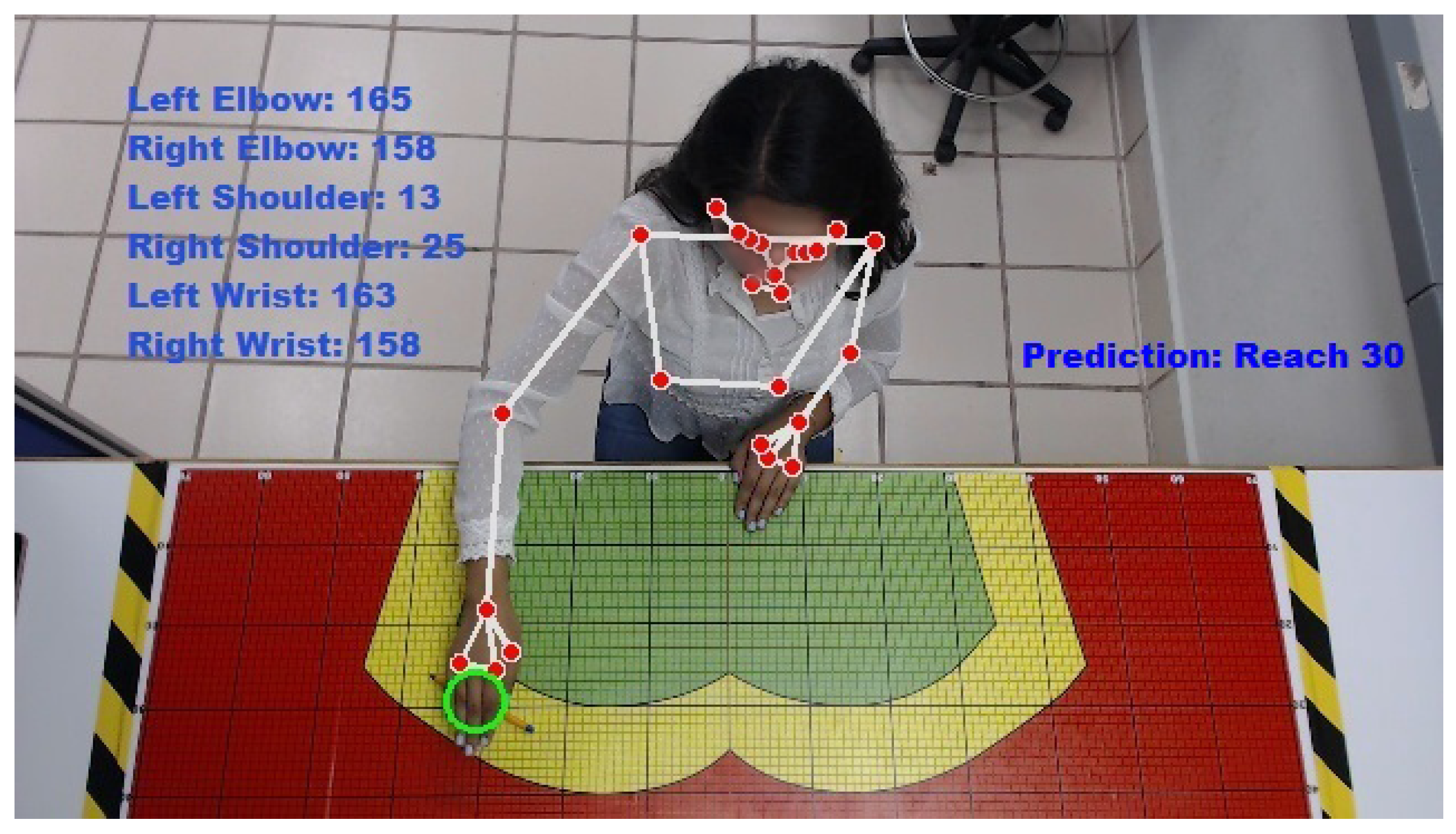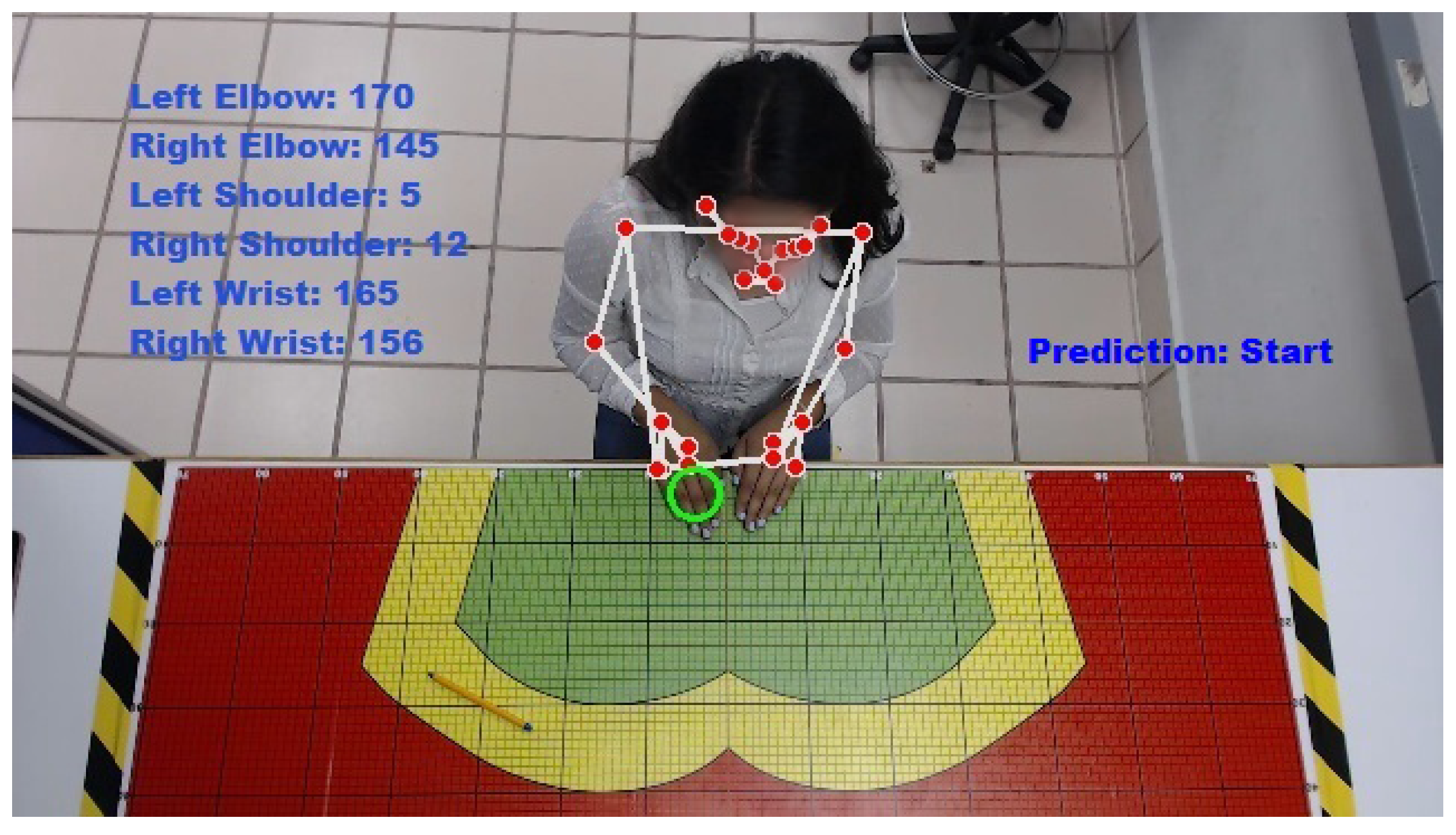 Table 5 present a critical use case of the system: detecting a severe ergonomic anomaly that would likely be missed in a manual observation. While most joints, including the left wrist at 171°, were within their normal functional ranges, the right wrist was measured at a severe extension of 188°. This angle far exceeds the safe anatomical limit of 180° and represents a critical hyperextension risk, as defined by the NIOSH guidelines. The most probable cause is a forced, unnatural movement to reach a distant or poorly located object without adequate body adjustment. From an MTM-2 perspective, this anomaly disrupts standard classification. The excessive time recorded (5.2 TMUs vs. a theoretical 3.5 TMUs) and the aberrant posture create ambiguity between a P2 (Place with adjustment) and a G2 (Complex grasp) code. This illustrates a scenario where ergonomic risk and motion standard complexity are intrinsically linked. The immediate industrial recommendation would be 1) to redesign the workstation ergonomics to eliminate the need for such extreme reaches, and 2) to consider implementing auxiliary supports or tools to maintain a neutral wrist posture. This case underscores the system’s value in proactively identifying high-risk movements that directly impact both worker health and process efficiency.