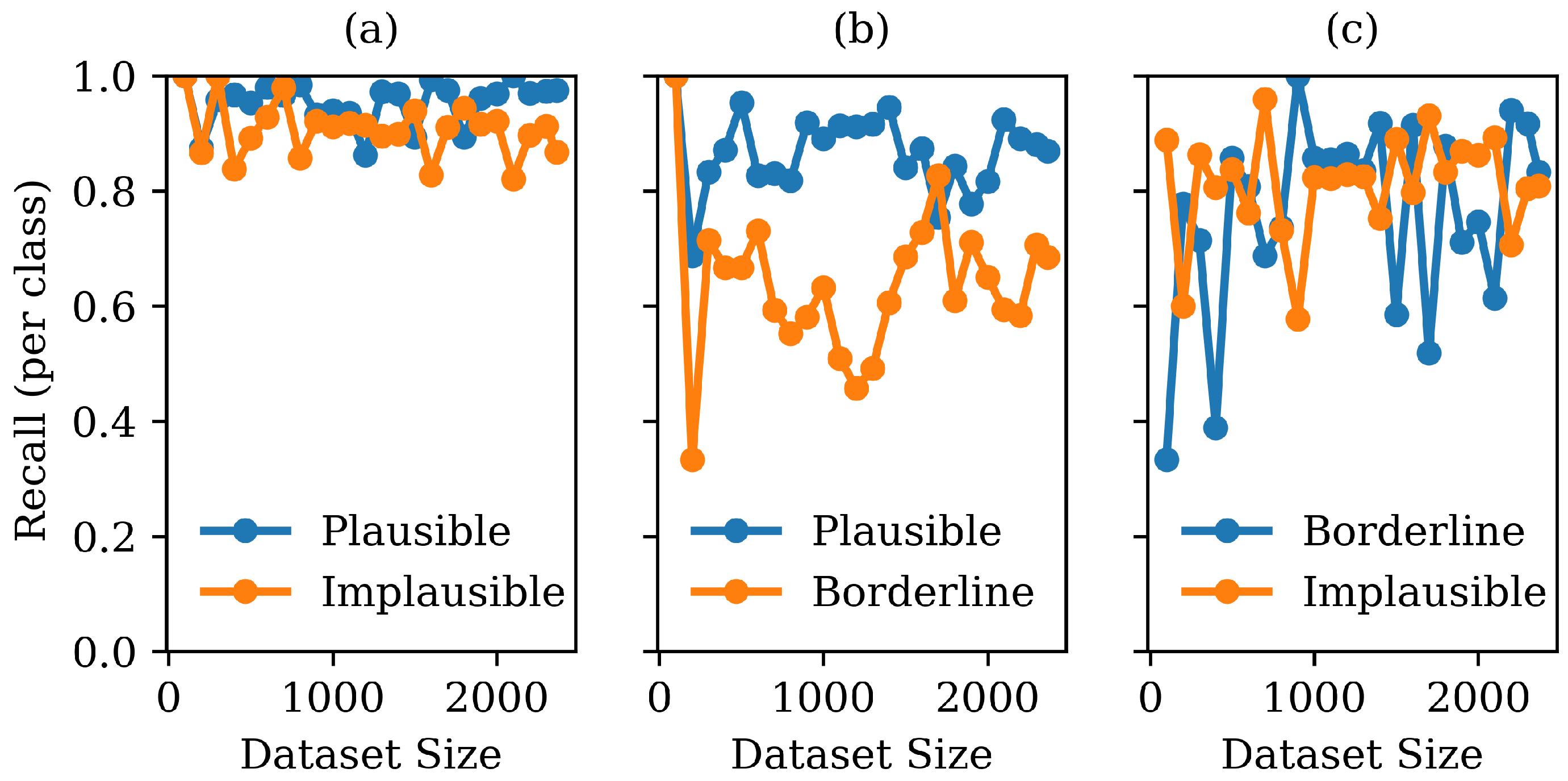 Graph showing recall for each class as a function of training set size (80/20 validation) in the pairwise classifiers: (a) plausible vs. implausible; (b) plausible vs. borderline; and (c) borderline vs. implausible.