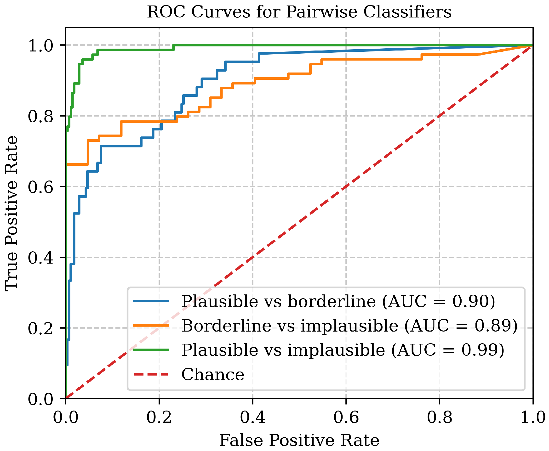 Three pairwise binary classification tasks (plausible vs. borderline; plausible vs. implausible; borderline vs. implausible) to quantify separability between categories.