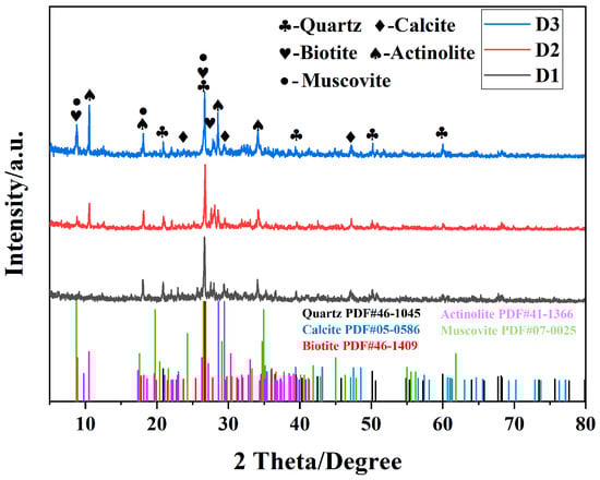 As shown in Figure 2, the three types of tunnel slags exhibit good crystallinity, with the phase compositions mainly consisting of quartz, calcite, biotite, actinolite, and muscovite. Notably, compared to D1, D2 and D3 show higher diffraction peak intensities for actinolite, suggesting that they may undergone more intense metamorphism. Additionally, the biotite content in D3 is significantly higher than that in D1 and D2, indicating that the tunnel slag particles primarily originated from Fe/Mg-rich metamorphic rocks. The relative enrichment of dark minerals such as biotite and actinolite in D2 and D3 contributes to their gray-to-black appearance.