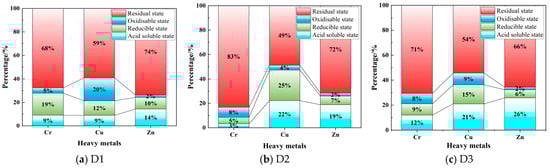 As shown in Figure 4, the speciation of key heavy metals (Cr, Cu, and Zn) in the tunnel slags was analyzed using an improved BCR sequential extraction method. In all three types of slags, Cr is primarily in the residual state, indicating that it is mainly encapsulated in silicate mineral lattices or present in insoluble primary minerals, thereby exhibiting very low environmental mobility under natural conditions. Notably, the residual state of Cr in D2 reaches approximately 83%, which can be attributed to the strong immobilization effect of Ca/Fe-rich minerals (calcite and actinolite). The acid-soluble states of Cr in both D1 and D3 exceed 9%, indicating a relatively higher potential release risk. Particularly, the sum of the acid-soluble and -reducible states of Cr in D1 reaches 28%, meaning that Cr in these states is relatively easily released and mobilized under acidic or reducing environments. Although Cu is also primarily present in the residual state, the proportion of non-residual states is significantly higher than that of Cr, indicating relatively lower stability. Specifically, the oxidizable state of Cu in D1 accounts for about 20%, suggesting considerable association with organic matter or sulfides, thereby posing a release risk under oxidizing conditions. In both D2 and D, the acid-soluble states of Cu exceed 20%, accompanied by a considerable proportion in the reducible states, indicating that Cu in D2 and D3 is largely associated with carbonate minerals (e.g., calcite) and Fe/Mg oxides and rendering it highly sensitive to decreasing pH values. Zn is mainly in the residual state in the tunnel slags, indicating high stability. However, the acid-soluble state of Zn is relatively high in all three types of tunnel slag, suggesting the presence of substantial Zn in adsorbed states or associated carbonates. Consequently, Zn has a high potential for preferential release and migration when environmental pH decreases.