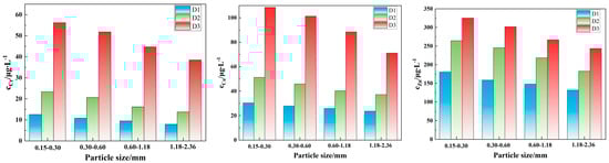 The influence of particle size on the leaching concentration of Cr, Cu, and Zn under acidic conditions (pH = 3, L/S = 10:1, and 30 °C) is shown in Figure 5. For all three tunnel slag, the leaching concentrations of Cr, Cu, and Zn decrease significantly with the increase in particle size, which is primarily because larger particle sizes result in a smaller specific surface area, greatly reducing the solid–liquid contact interface and thus slowing the diffusion and dissolution of heavy metal ions from the mineral matrix into the solution. The order of the elemental release concentration is consistently Zn > Cu > Cr. The high proportion of acid-soluble states in Zn facilitates its easy release under acidic conditions, leading to elevated leaching concentrations. In contrast, the release of Cu is dependent on the dissolution of carbonate or sulfide inclusions, while the high residual state of Cr results in the lowest release concentration. Furthermore, under the condition of acidic leaching, the heavy metal leaching concentrations follow the order D3 > D2 > D1, which is highly consistent with the mineral composition and heavy metal speciation. The high acid-soluble fraction of heavy metals in D3 particles, combined with their biotite-rich mineral characteristics, accelerates the oxidation and dissolution of sulfides and other materials, promoting heavy metal release. The Ca-rich characteristics of D2 facilitate rapid dissolution of calcite under acidic conditions, releasing adsorbed heavy metals. Conversely, D1, which is composed mainly of silicate minerals such as quartz and muscovite, exhibits good acid erosion resistance, significantly inhibiting heavy metal dissolution.