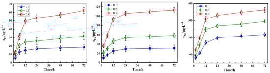 As shown in Figure 6, under fixed conditions (particle size: 0.3–0.6 mm, pH = 3.0, and 30 °C), the cumulative leaching amounts of Cr, Cu, and Zn from the three types of tunnel slags gradually increase with extended leaching time. Within the initial 12 h, the leaching concentrations of heavy metals increase sharply, primarily due to the rapid desorption or dissolution of the acid-soluble and partially reducible states under strong acid conditions. As the immersion time extends further, the release rate decreases significantly, mainly because the release of stable heavy metal states likely requires the destruction of mineral lattices and the acid corrosion process of silicates such as biotite and actinolite is slow. The time-dependent leaching behavior underscores an initial fast phase controlled by surface reactions, followed by slow diffusion which is limited release from the mineral matrix.