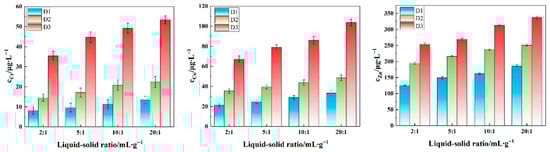 Under fixed acidic leaching conditions (particle size: 0.3–0.6 mm, pH = 3.0, and 30 °C), the order of the heavy metal release concentration remained as Zn > Cu > Cr under different L/S ratios, reaffirming that Zn is most sensitive to acidic environments due to its high acid-soluble state, while Cr is most difficult to release due to its high residual state (Figure 7). The cumulative leaching amounts of Cr, Cu, and Zn gradually increased with increasing L/S ratios. A high L/S ratio significantly reduces the concentration gradient of heavy metals in the solution, enhances the ion diffusion rate at the solid–liquid interface, and accelerates the desorption of acid-soluble metals and the dissolution of carbonate phases. Conversely, a low L/S ratio inhibits mass transfer efficiency and dissolution rates within the solution, thereby weakening the dissolution of internal carbonate minerals and the desorption of adsorbed heavy metals.