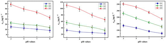 As shown in Figure 8, under fixed conditions (particle size: 0.3–0.6 mm, L/S = 10:1, 30 °C), the leaching amounts of Cr, Cu, and Zn from the three tunnel slags gradually decrease as the pH increases (pH = 3.00, 5.00, 7.00, and 9.00). Under acidic conditions, highly reactive acid-soluble heavy metals rapidly dissociate, and the dissolution of carbonate minerals further facilitates metal release. As the pH value rises to neutral and alkaline ranges, the solubility of heavy metal hydrolysis products decreases significantly, and the enhanced negative surface charge of the tunnel slags promotes re-adsorption of heavy metal ions, thereby further suppressing their dissolution.