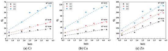Under acidic leaching conditions (pH = 3, L/S = 10:1, and 30 °C), the time-dependent cumulative leaching amounts of Cr, Cu, and Zn from the tunnel slags conform to the Elovich equation (R2 > 0.88), indicating that the release process of heavy metals is primarily controlled by diffusion mechanisms (Figure 10 and Table 2). The initial release rate (α) and sustained release capacity (β) for the three heavy metals in different tunnel slags follow the order Zn > Cu > Cr, which is correlated strongly with the proportion of the acid-soluble fraction in their speciation. The S- and Fe/Mg-rich characteristics of D3 promote accelerated sulfide oxidation under acidic conditions, leading to a high α and strong β for heavy metals, particularly for Zn and Cu. The rapid dissolution of carbonate minerals in D2 releases adsorbed and bound heavy metals, resulting in a relatively fast α. D1, with its high content of inert silicate minerals (quartz and muscovite) and residual state of heavy metals, exhibits the lowest α and the weakest β, corresponding to the mildest leaching behavior.