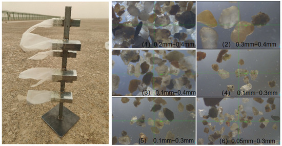 To ensure that the numerical simulation results closely reflect real operating conditions, this study takes as an example a model aircraft operated by a commercial aviation group in the southern Xinjiang region. A field investigation was conducted at Shache Yarkant Airport, located at 77°4′31. 087″ E and 38°14′11. 621″ N, as shown in Figure 1. The airport lies within the Tarim Basin, one of China’s largest inland basins, surrounded by expanses of Gobi and desert. Spring (March–May) and autumn (September–November) are peak seasons for dust weather, during which sandstorms can reduce visibility to only a few hundred meters, affecting aircraft takeoff, landing, and ground operations. The duration of dust events ranges from several hours to multiple days, typically fluctuating with wind speed. This airport serves as a representative site for the characteristic dust weather of southern Xinjiang. A vertical sand collector, as shown in Figure 2, was deployed for 32 h in a stationary setup, with sampling heights set at 20 cm, 26 cm, 32 cm, 38 cm, 44 cm, and 50 cm. The collected sand particles were subsequently analyzed using a high-precision electron microscope, as illustrated in Figure 2.