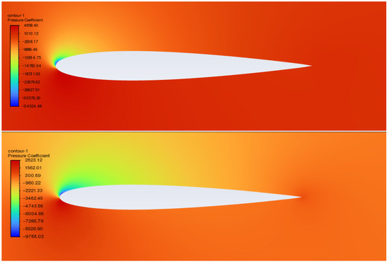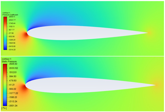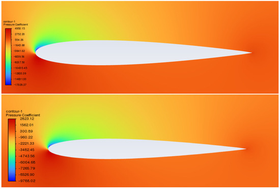 Using a dust concentration of 0.0769 kg/m3 as an example, with fixed wind speeds of 5 m/s, 15 m/s, and 30 m/s, the angle of attack was varied. The simulated results for the static pressure distribution of the fluid around the airfoil are Figure 6, Figure 7 and Figure 8 shown below: