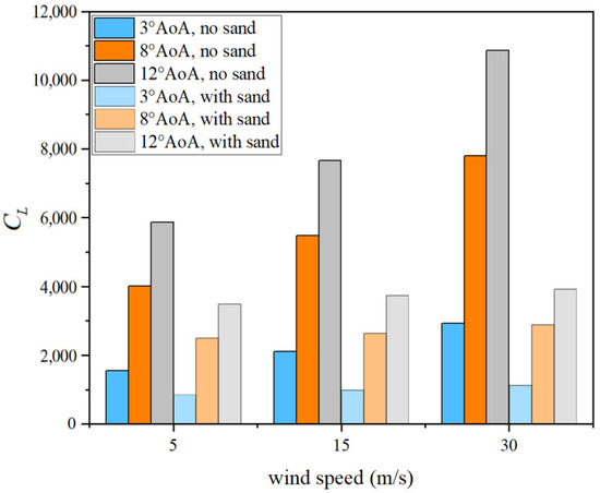 This trend indicates that even at high wind speeds with abundant flow kinetic energy, the presence of sand and dust particles cannot effectively suppress the occurrence of stall; instead, it exacerbates the degree of lift collapse at large angles of attack.