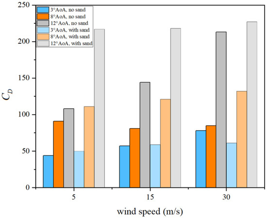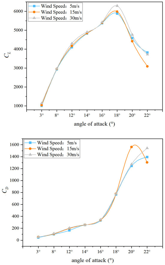 These are key parameters for assessing wing performance. The following section presents a comparative analysis of the aerodynamic coefficients for clean-air and dust-weather conditions across different angles of attack and wind speeds.