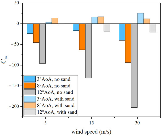 Dust exerts a strong destabilizing influence on the pitching moment across all wind speeds, often reversing its sign and threatening flight attitude stability. At 5 m/s, the moment reverses at 3° (−24.4 → +3.1, +112.7%) and 8° (−46 → +13. 6, +129. 6%), while at 12°, it nearly neutralizes (−96.4 → −1.1). At 15 m/s, the reversals are even stronger: at 3° (−17.3 → +16.2, +193.6%) and 8° (−63.2 → +16.7, +126.4%), with major weakening still evident at 12° (−131.4 → −18.5). At 30 m/s, despite higher flow attachment, dust continues to cause large variations: at 3° (−40.5 → +25.0, +161.7%) and 8° (−94.3 → +11.9, +112.6%), with significant reduction at 12° (−202.7 → −20.5, +89.9%). Overall, dust tends to reverse the pitching moment at low and moderate AoA and strongly weaken it at higher AoA, reflecting upper-surface suction loss, boundary-layer disturbance, and forward shift of the aerodynamic center. This disruption undermines pitch stability and poses serious risks during sensitive maneuvers such as turning or pitch adjustments.